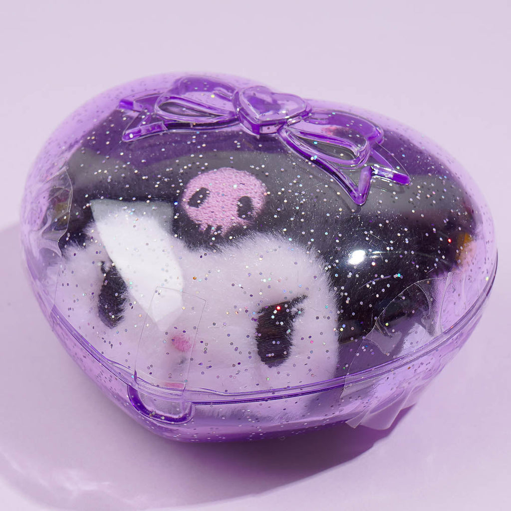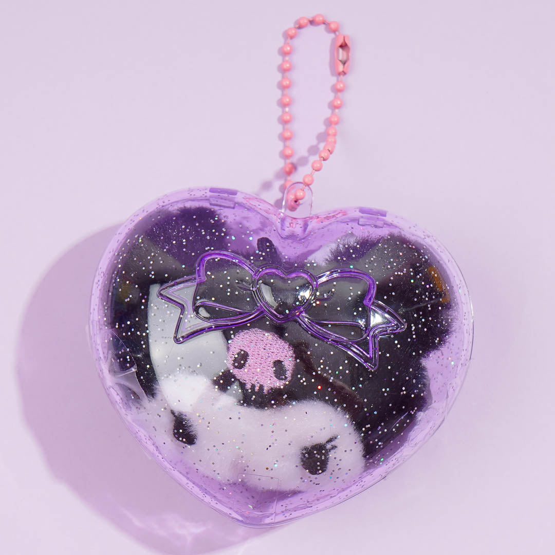 Decorate your bag with this super kawaii glittery heart-shaped charm. Inside is a cute Kuromi plush toy! You can open and close the case to play with Kuromi.