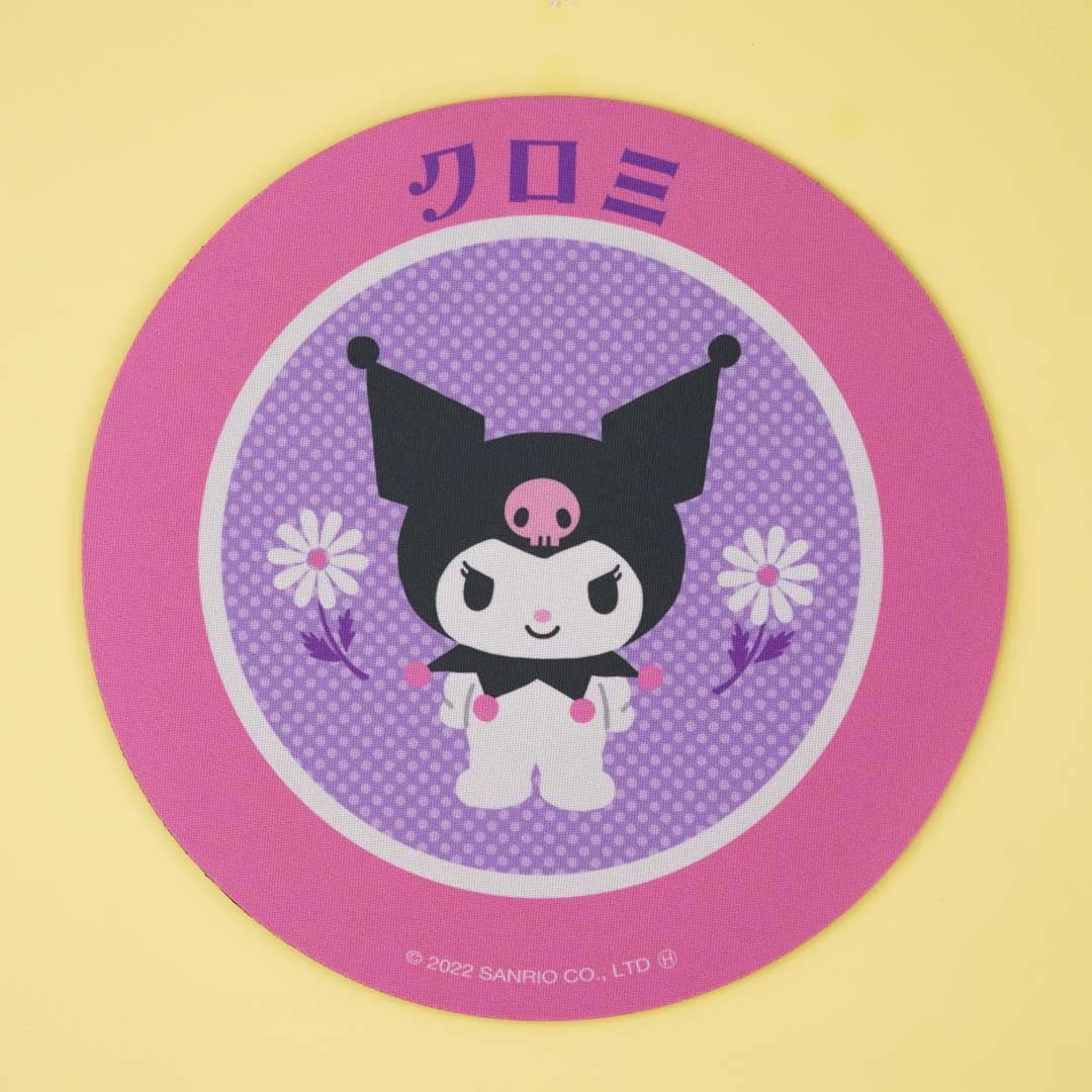 Add a dose of cuteness to your remote work set-up with this circle-shaped mouse pad! It features a vintage-inspired illustration of Kuromi with flowers.