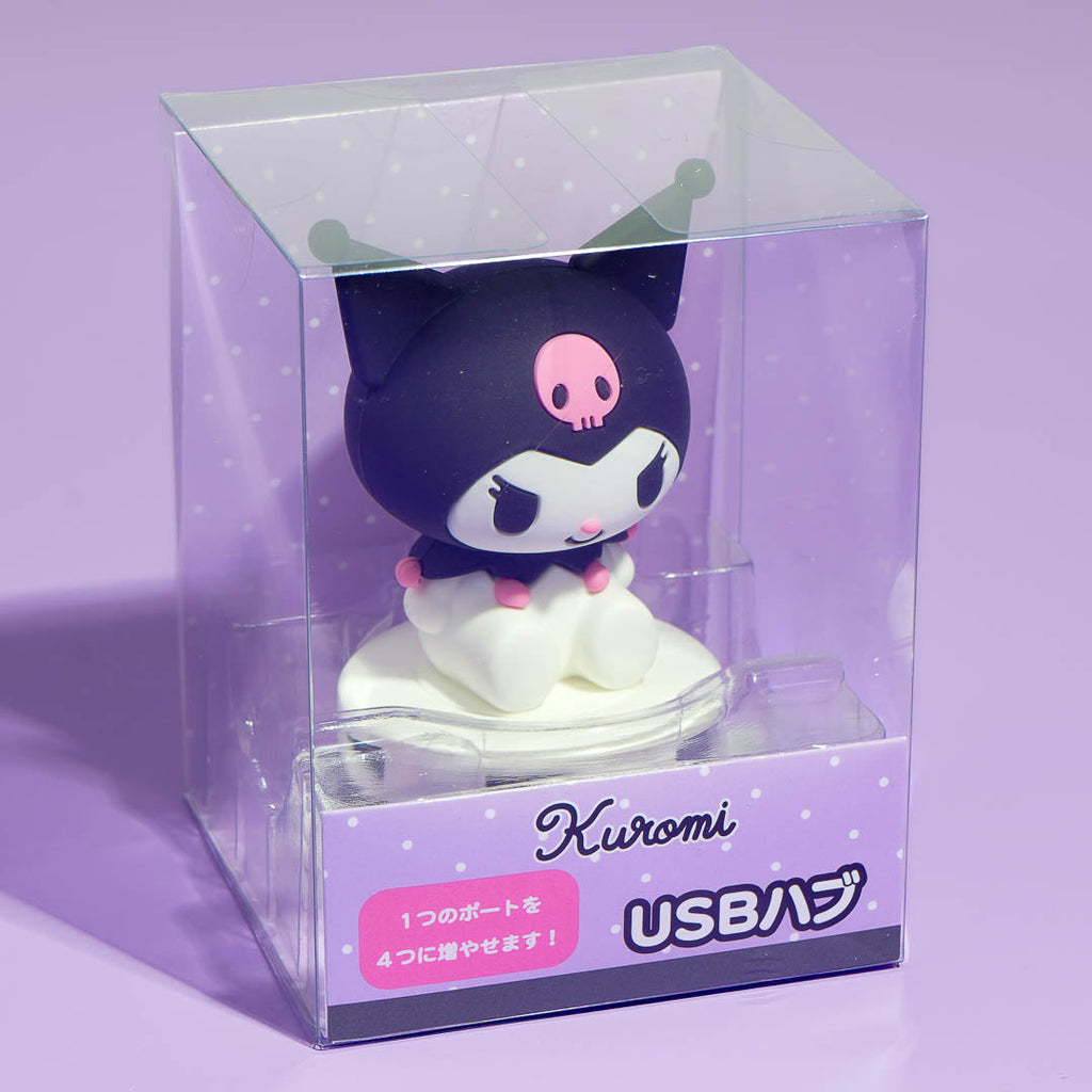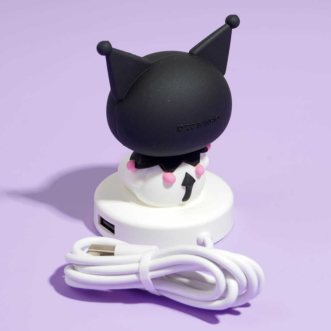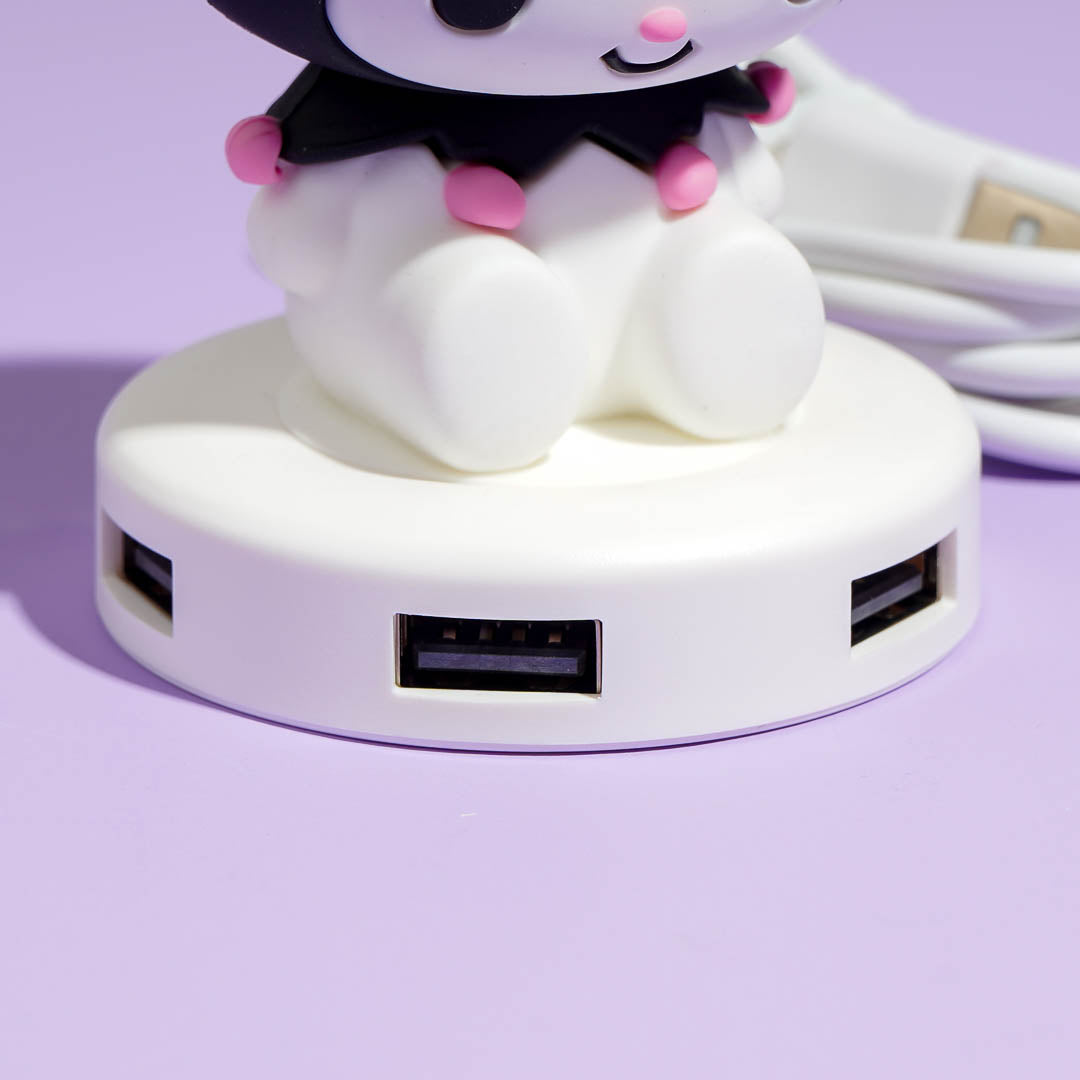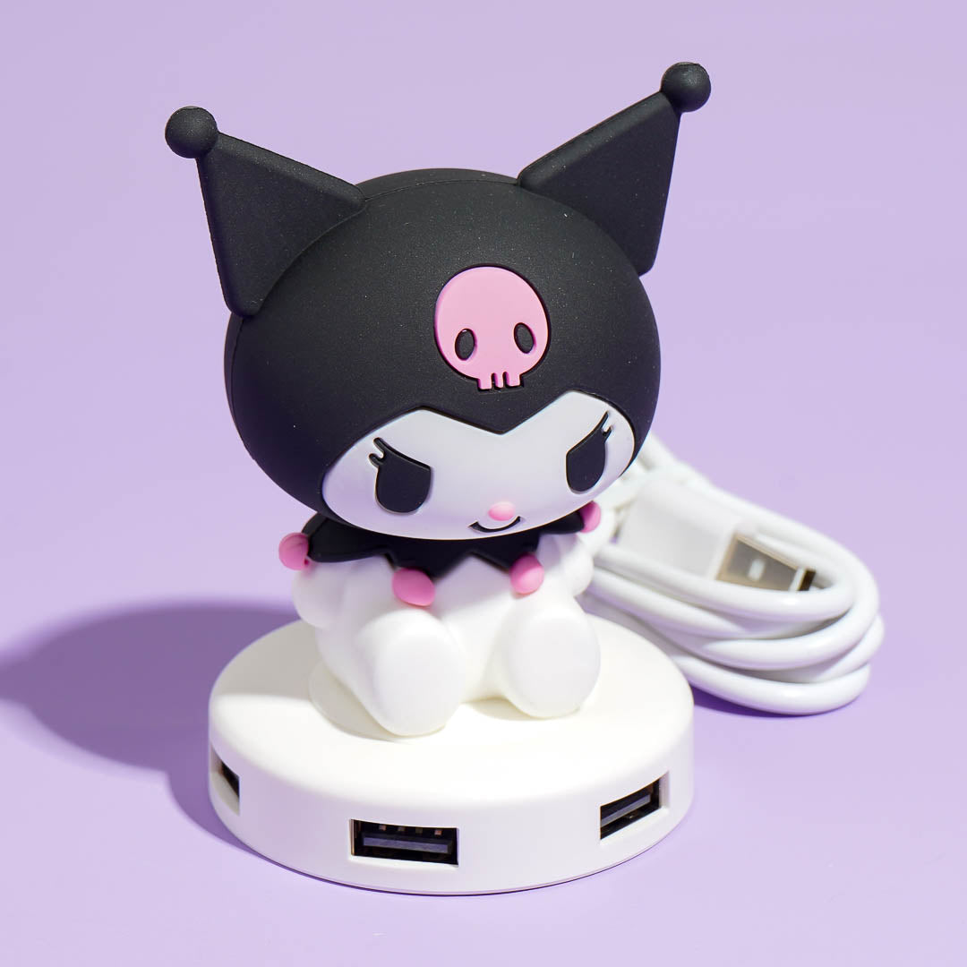 Complete your kawaii desk setup with this cute USB hub! It features a cute 3D Kuromi seated on a base with four USB ports. You can connect your keyboard, phone cable, and other tech devices!