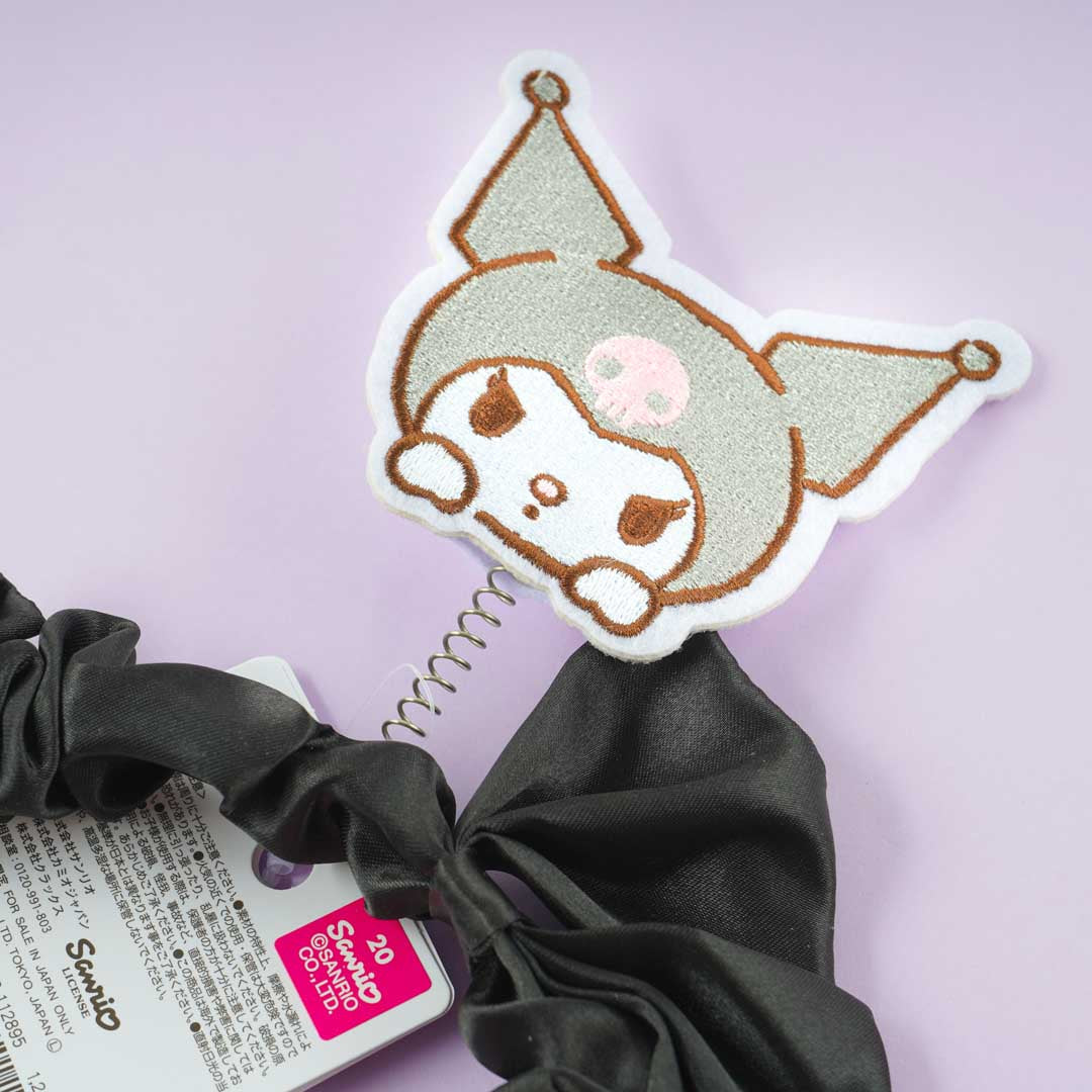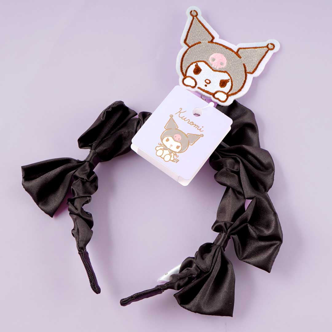 Stand out from the crowd by wearing this uniquely kawaii headband! It has three large black ribbons all over it. The headband is also decorated with a swinging Kuromi charm that’s attached to a spring.