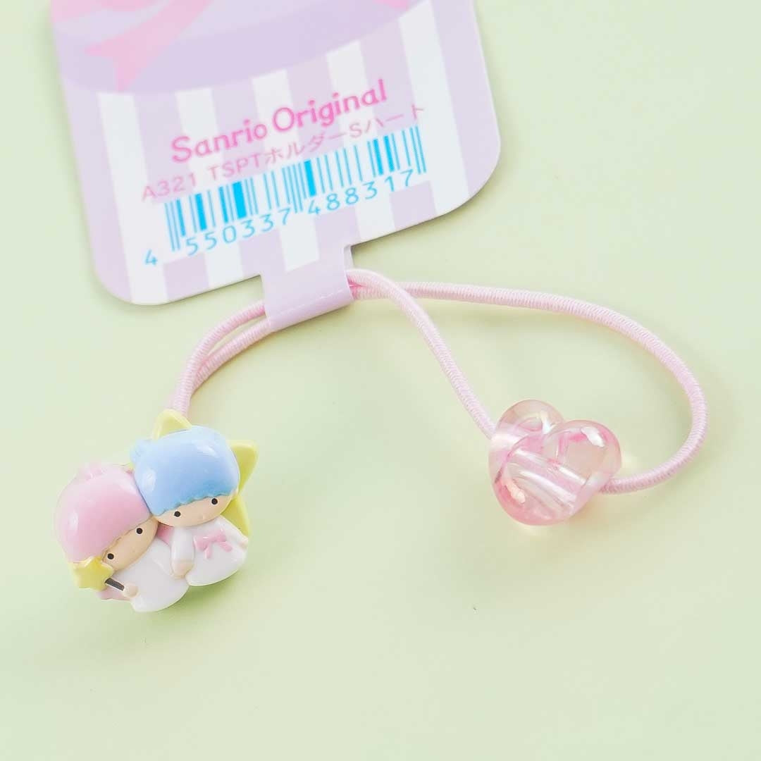 • An elastic hair tie with a holographic heart decor and a charm featuring the Little Twin Stars
