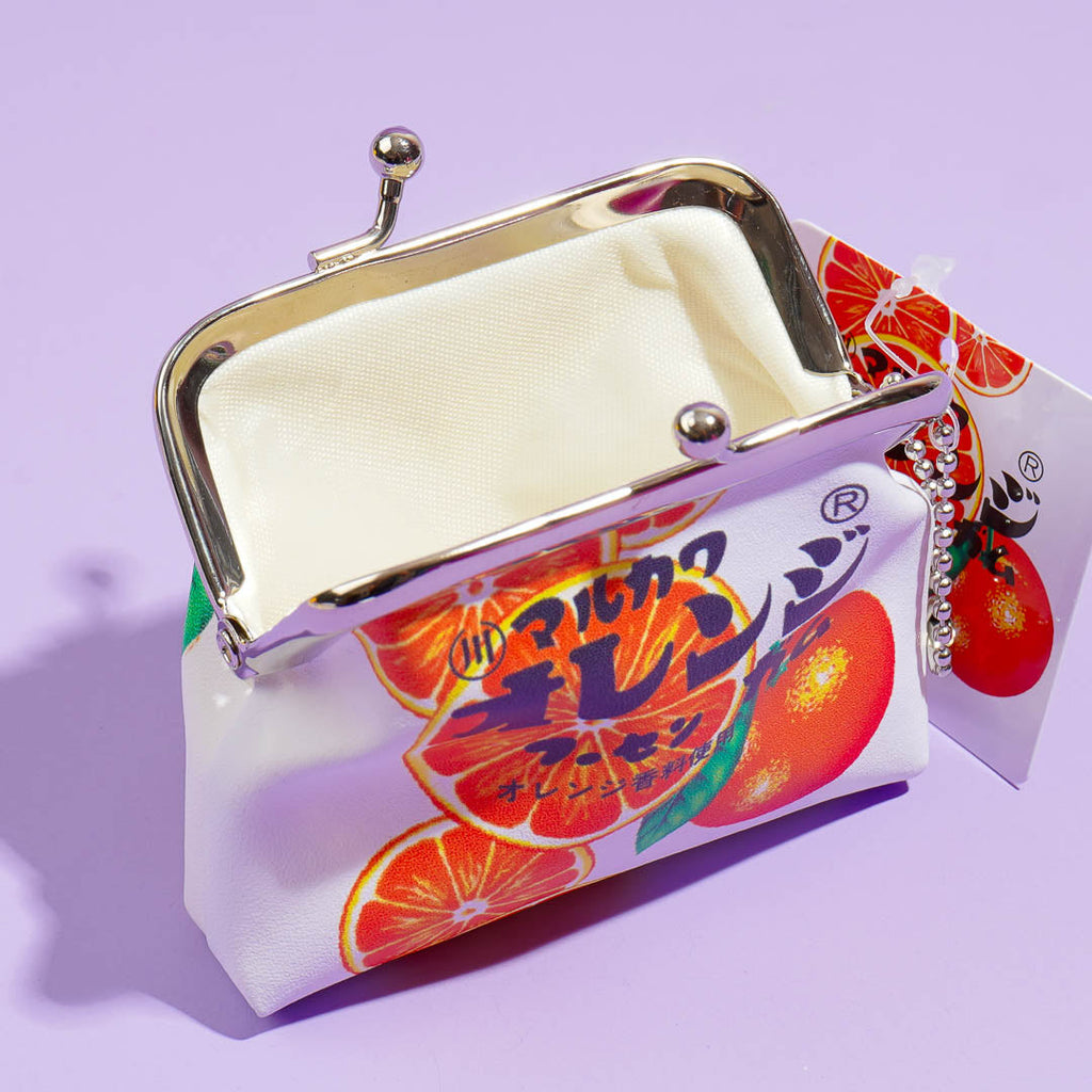 This cute coin purse is covered in prints of the Marukawa Fusen Gum packaging design. Use it to store your loose change! It has a metal clasp to keep your coins safe.