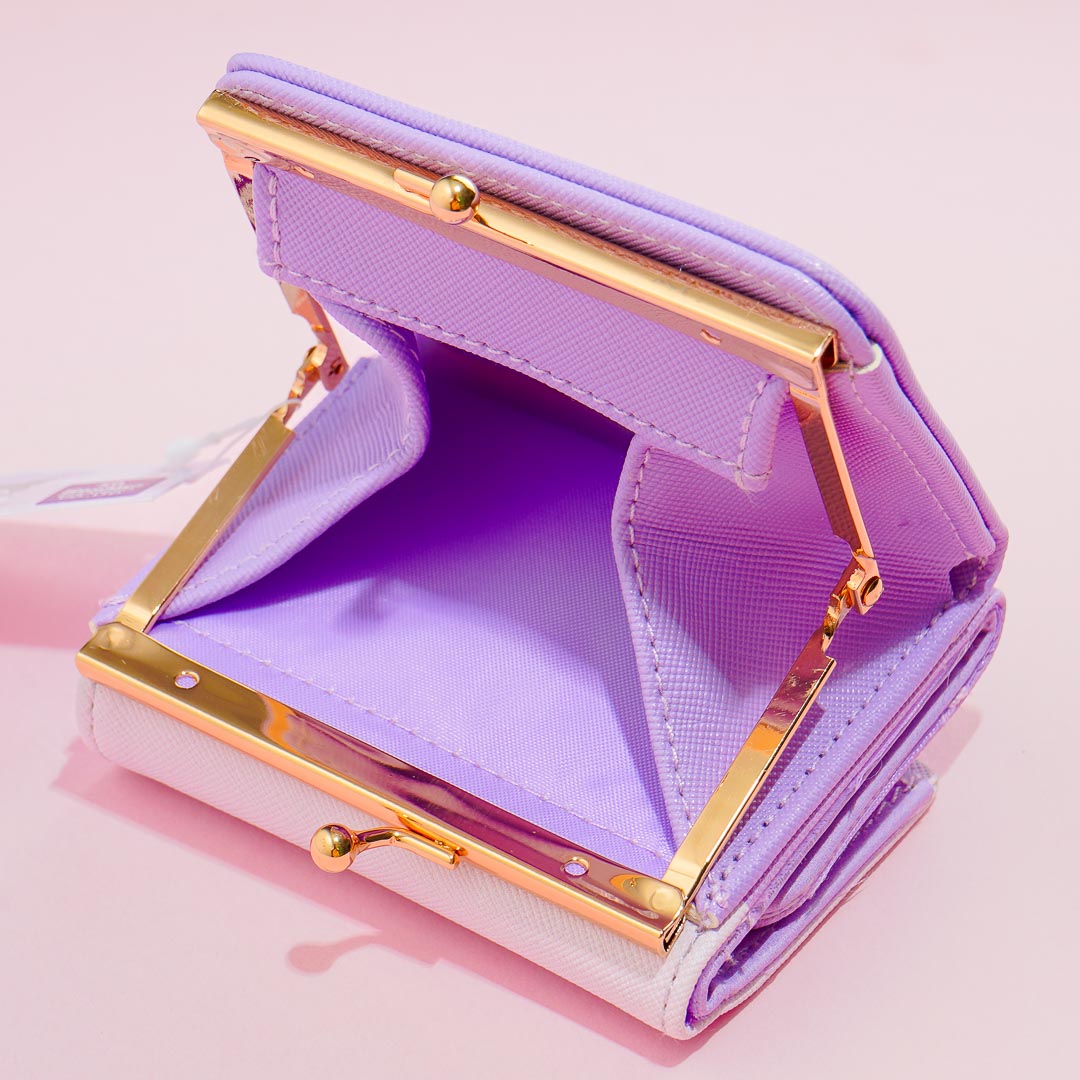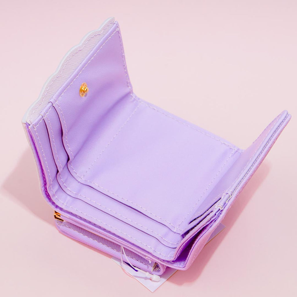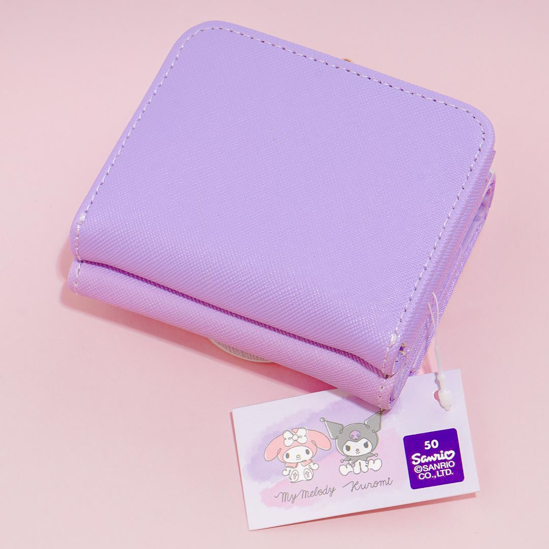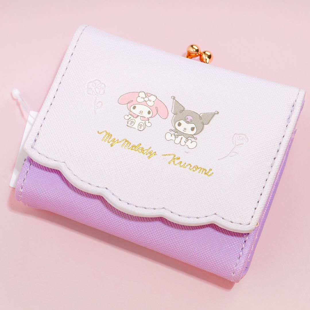 Bring this kawaii wallet when you go shopping with your besties! It's decorated with an illustration of My Melody and Kuromi with some engraved flowers. The wallet comes with three note pockets and a clasped-back coin purse!