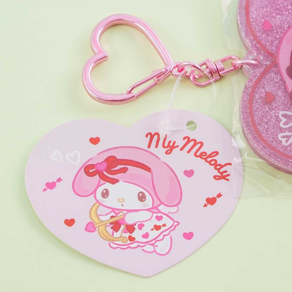 Jazz up your sling bag with this kawaii die-cut charm! This glittery charm features My Melody wearing a cupid costume. Her name is also printed on the backside. This heart-shaped acrylic charm comes with a metal clip.