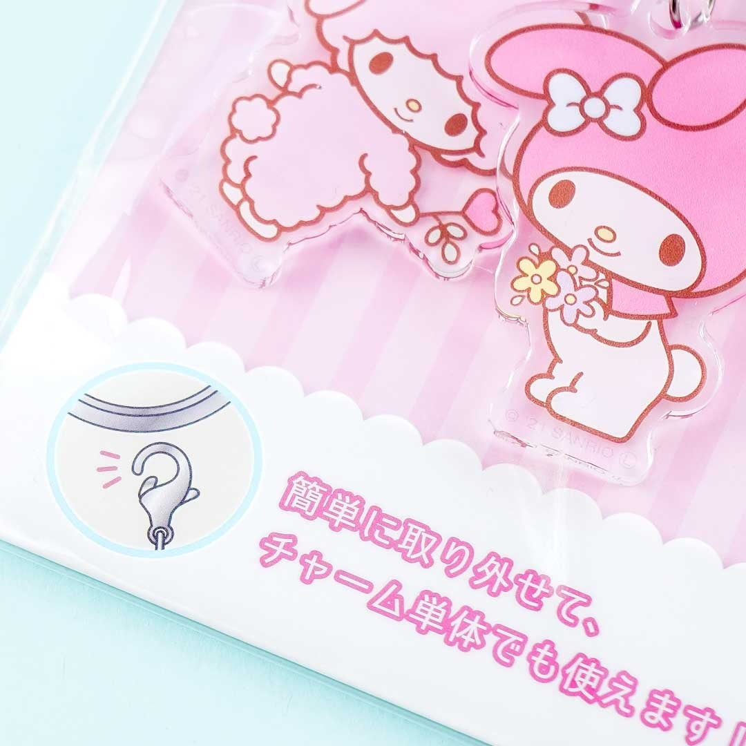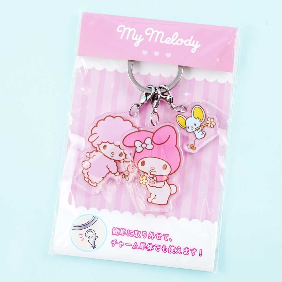 • A kawaii keychain with three different acrylic charms featuring My Melody and her friends