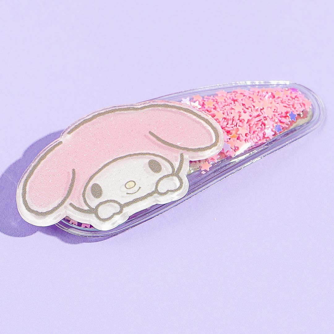 Watch the shiny pink stars move inside as you shake this cute transparent hair clip! It also comes decorated with a kawaii die-cut My Melody head charm.