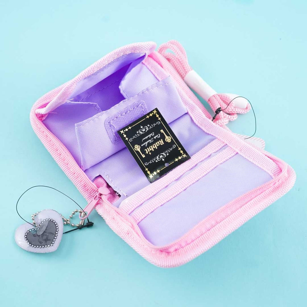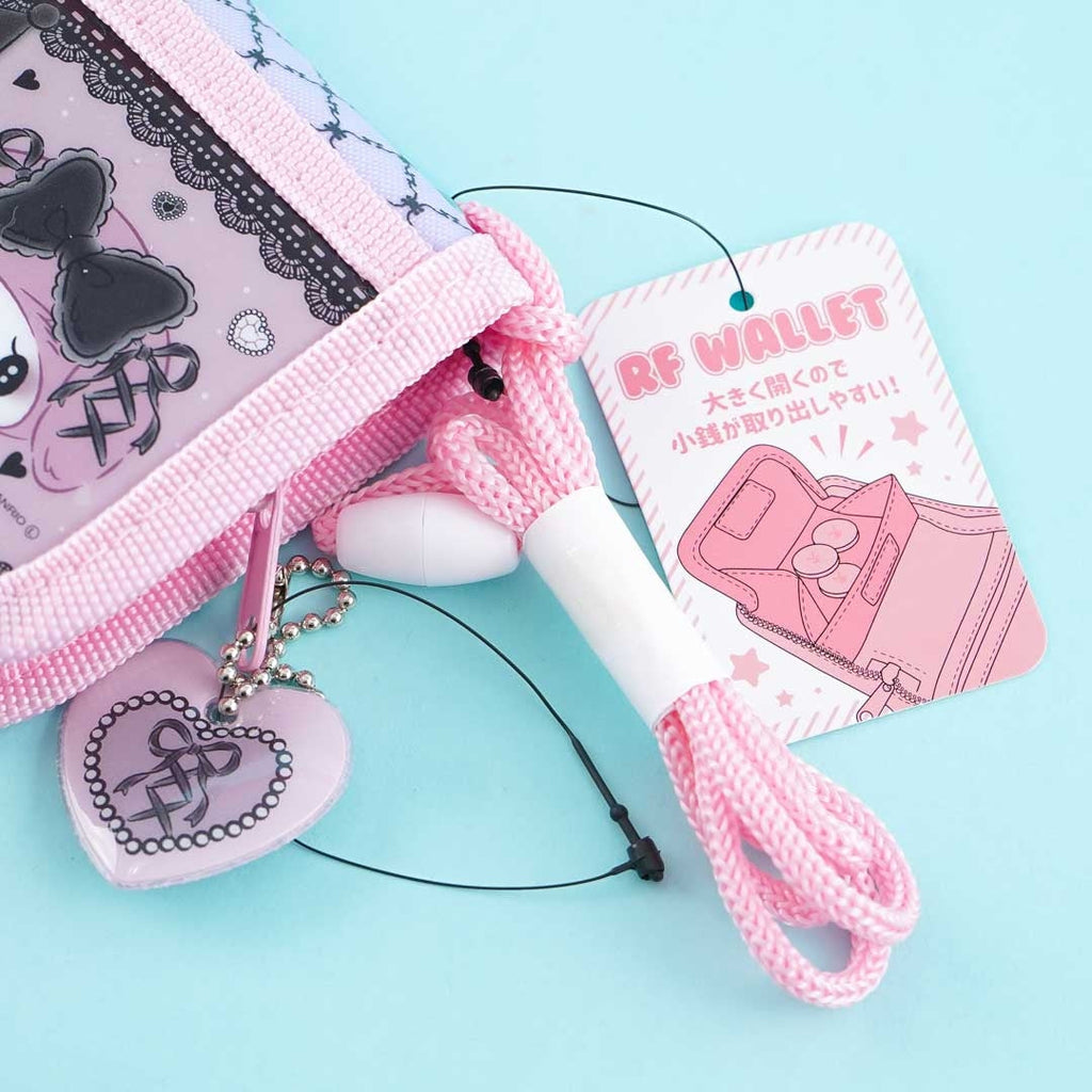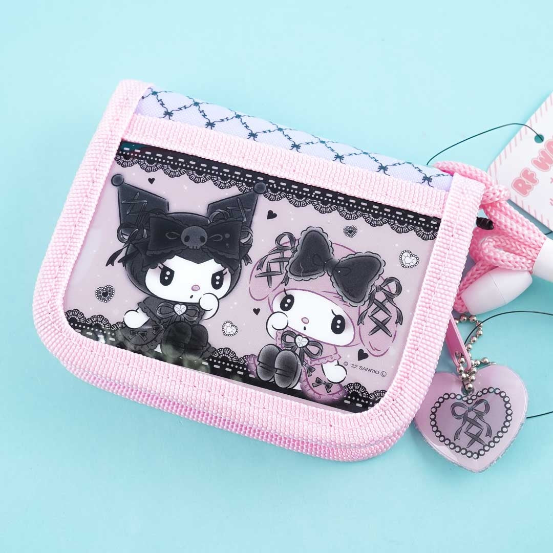 This cute bi-fold wallet features a print of My Melody & Kuromi wearing kawaii gothic lolita dresses. It has multiple pockets, a zipper closure, an adjustable strap, and a heart-shaped charm with a removable ball chain.