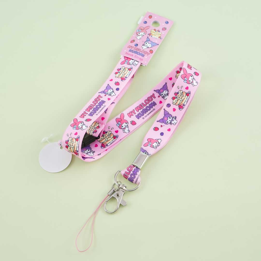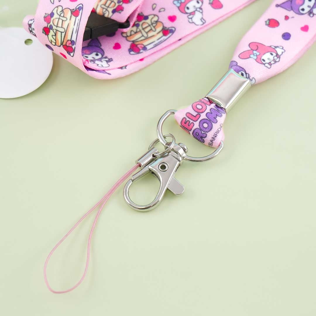 Use this kawaii lanyard to carry your IDs and bus passes! It's decorated with prints of My Melody and Kuromi together. This lanyard has an adjustable strap, a mobile phone loop, and a metal clip.