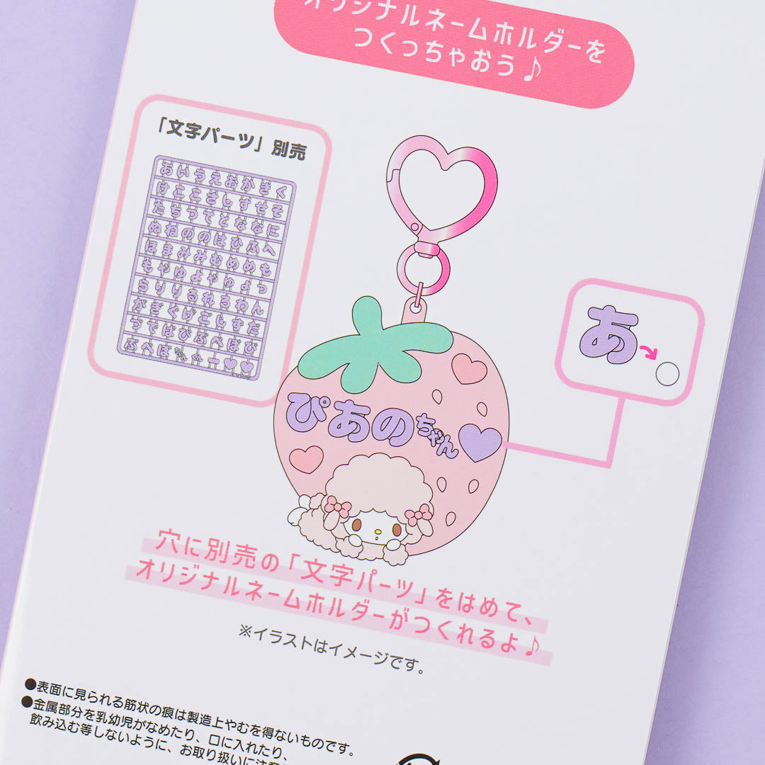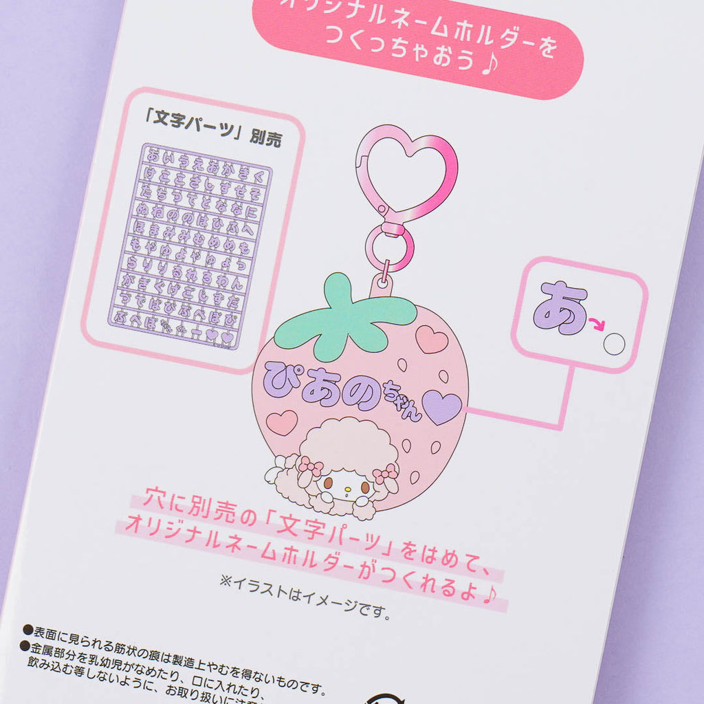 This kawaii keychain features a cute die-cut illustration of My Sweet Piano laying down next to a giant strawberry. You can customize this charm with hiragana decors. Use it to spell out your name before attaching it to your purse or bag.