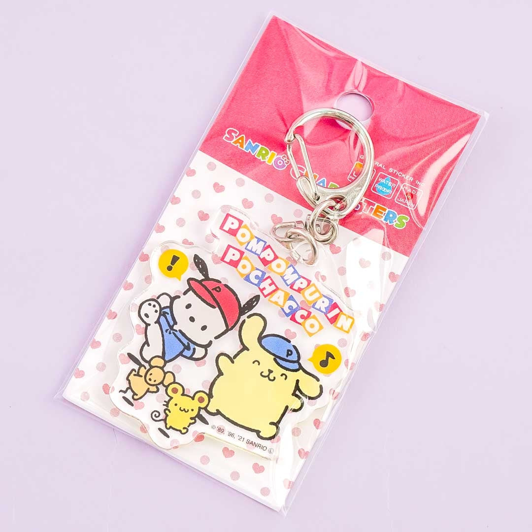 A die-cut acrylic charm featuring Pochacco and Pompompurin dancing