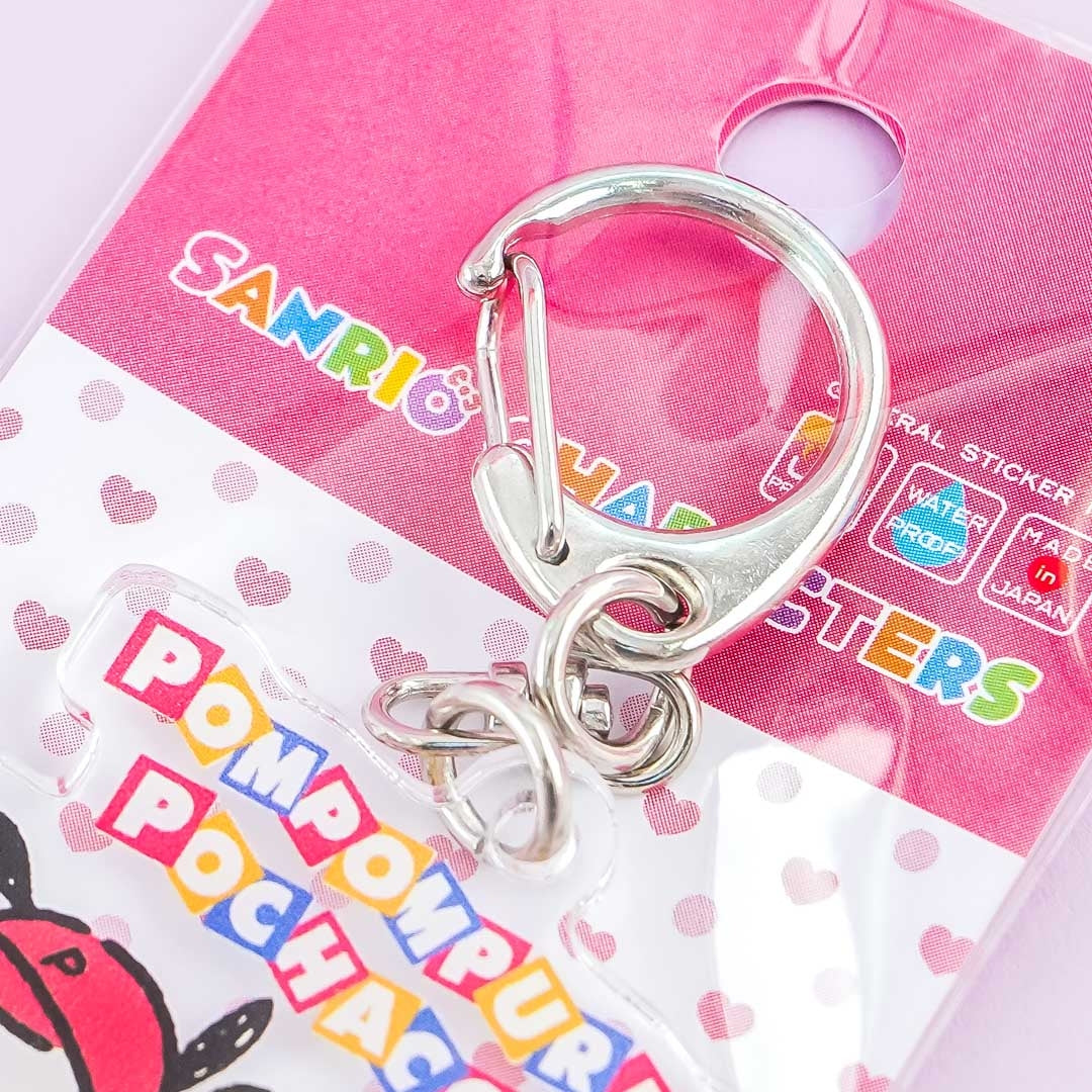 This die-cut acrylic charm features Pompompurin, Pochacco, and their tiny friends happily dancing with each other! Use its metal clip to attach this charm to your favorite backpack!
