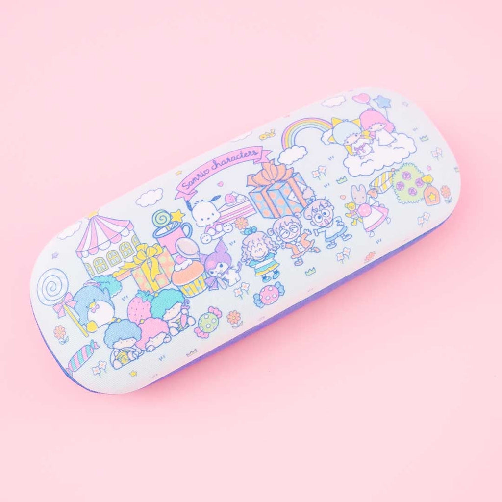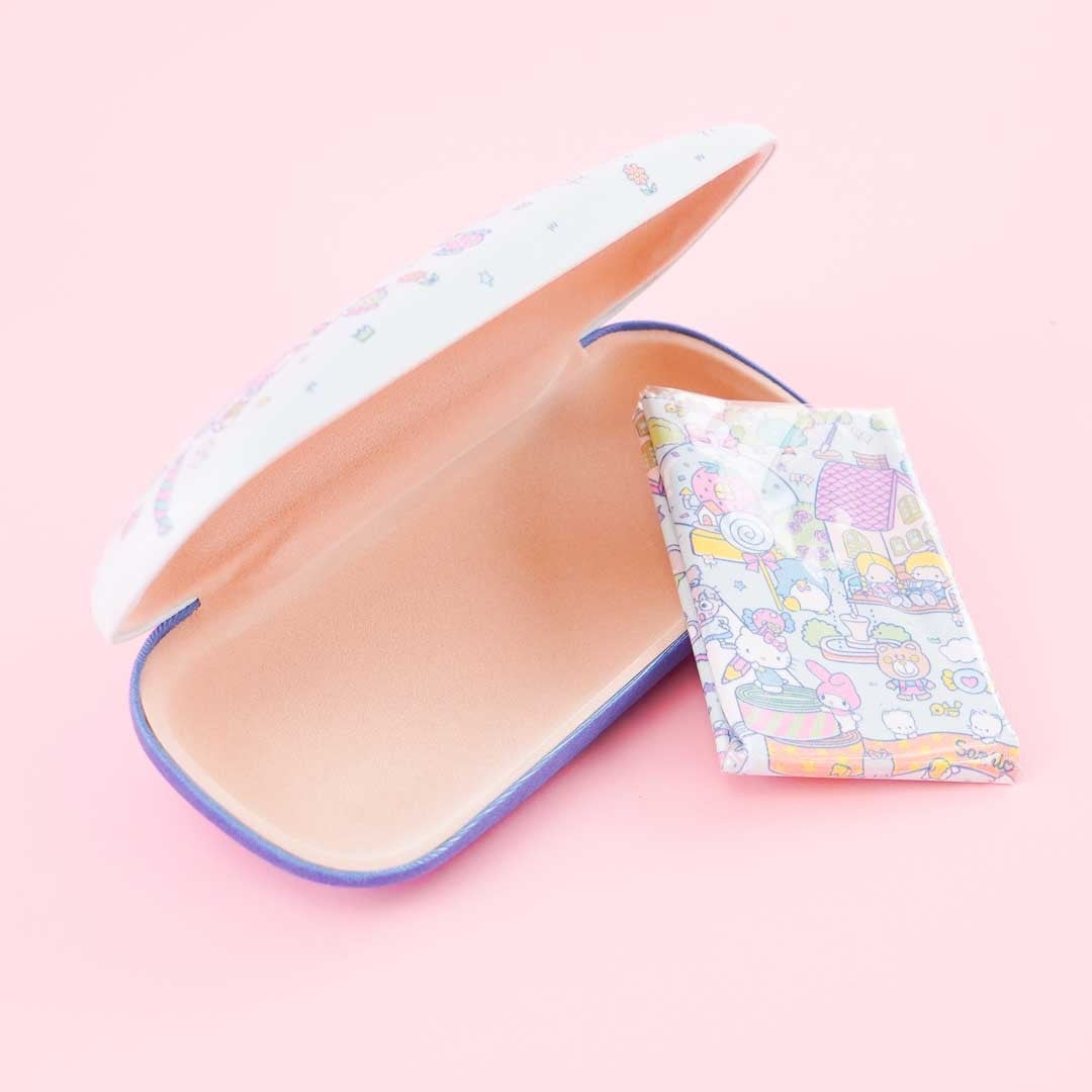 • A cute eyeglass hard case featuring prints of Sanrio characters at the carnival