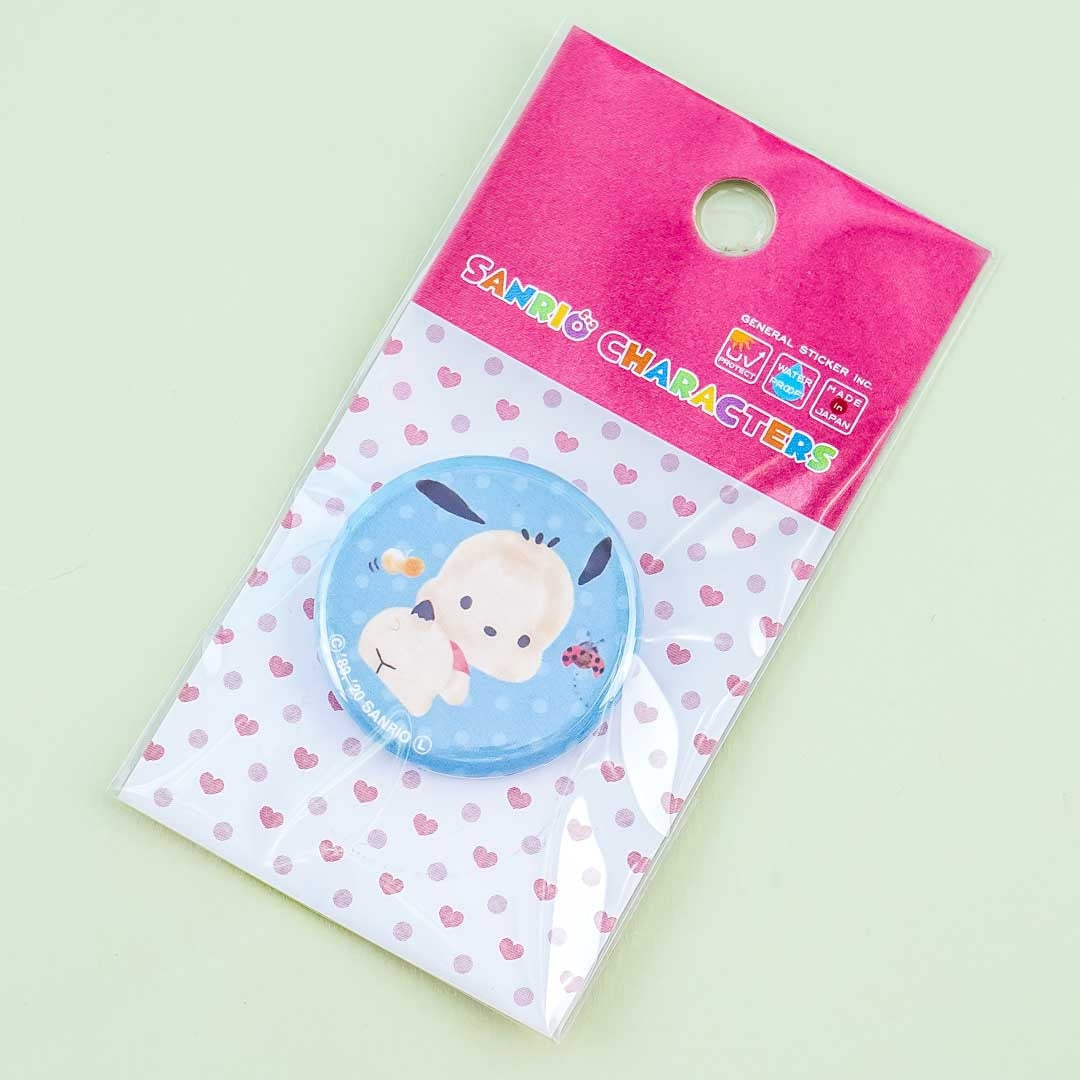 Give this polka-dotted badge as a cute gift! It’s made of steel and has a retro-inspired print of Pochacco playing with a bee and a ladybug.