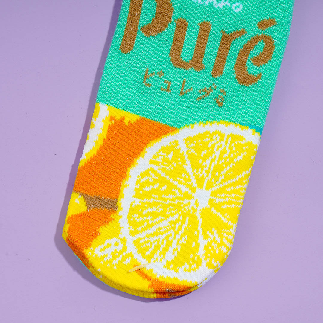 Add a touch of kawaii to your outfit by wearing this pair of ankle-length socks! It’s made from soft blended cotton fabric and resembles the cute packaging of lemon-flavored Pure Gummy candy.