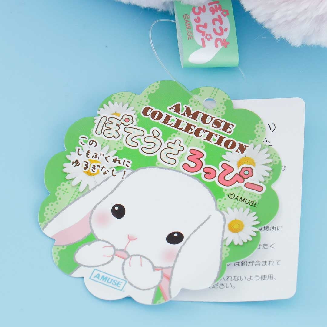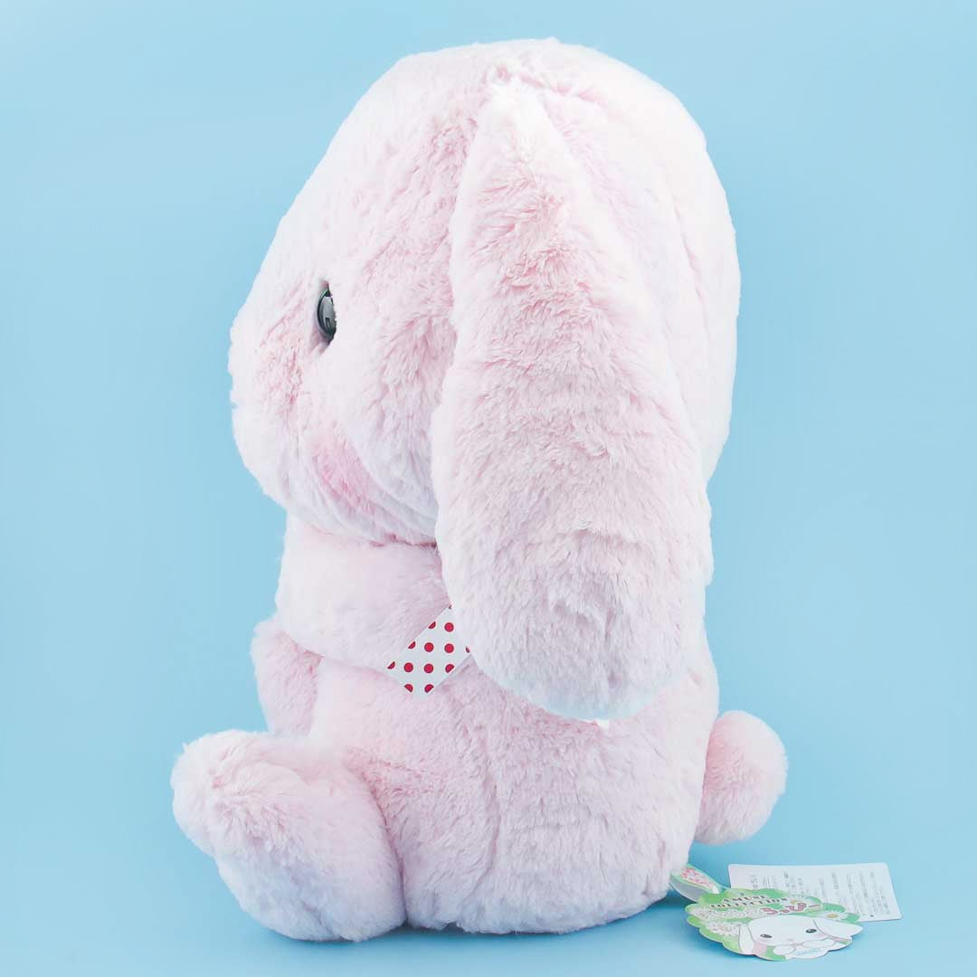 Mimi Pyon looks cute while holding her ear and wearing a red polka-dot ribbon around her neck. This ultra-soft pink bunny plushie from Pote Usa Loppy is so big and huggable.