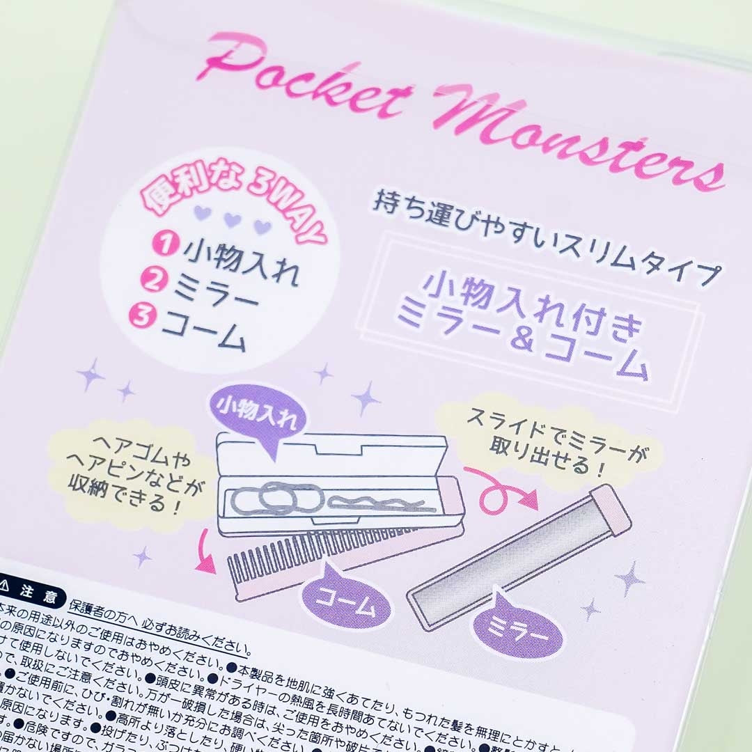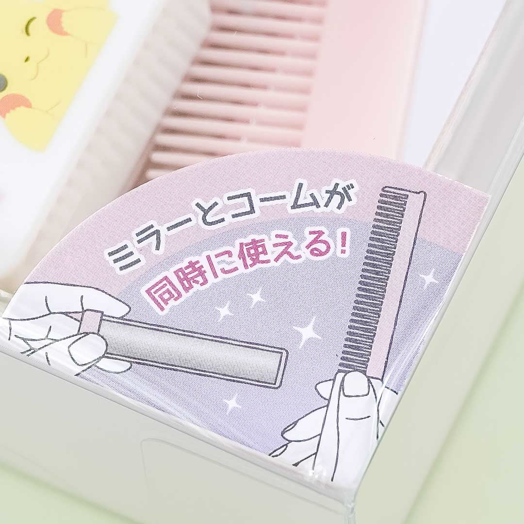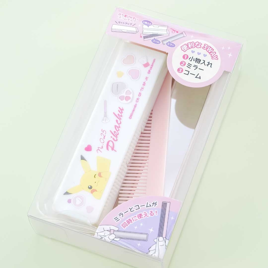 This kawaii comb set is decorated with prints of the Pokemon Pikachu playing with pretty cosmetics. Use it to give yourself a super cute hairstyle! This comb set comes complete with a mini comb, a compact mirror, and a carrying case.