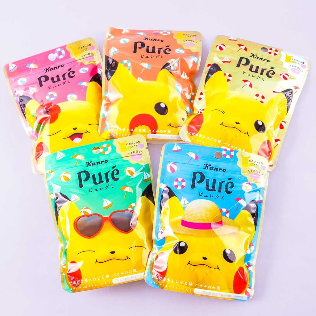 This summer-edition resealable pouch featuring Pikachu is a special collab with Puré Gummy and Pokémon and comes in five different designs! Unzip the bag and enjoy the three kinds of gummy candies shaped like hearts, swim rings, and tiny Pikachus! These sour powder-coated treats come in a mix of tropical fruit and soda flavors. You’ll receive a random gummy pack design when you order!