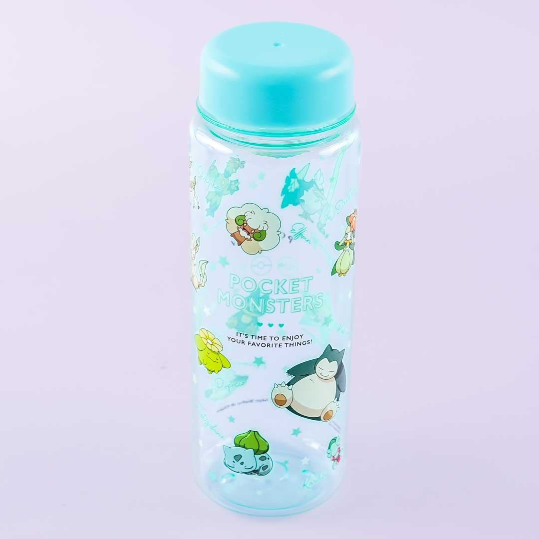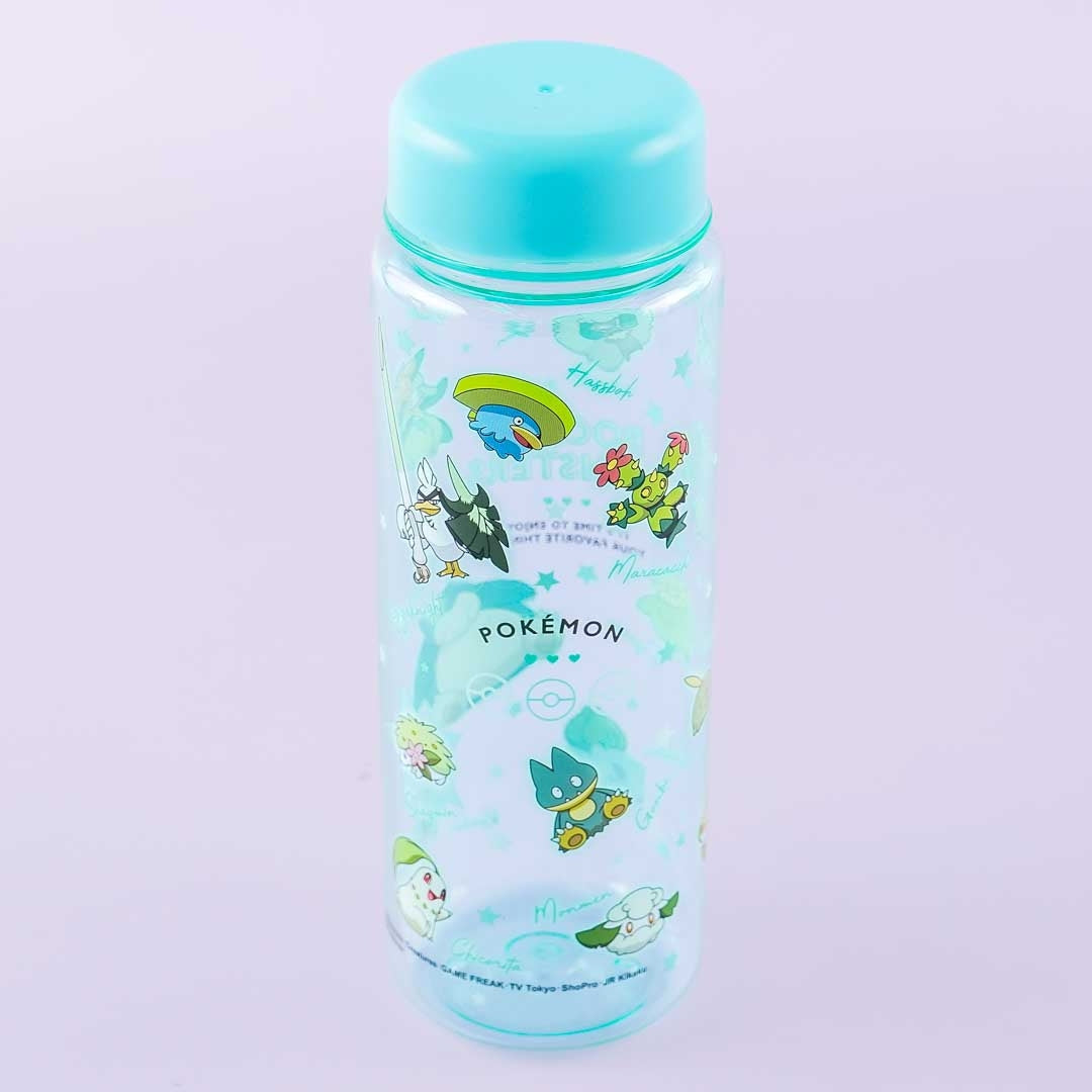 A kawaii clear water bottle showcasing prints of mostly Grass-Type Pokemon