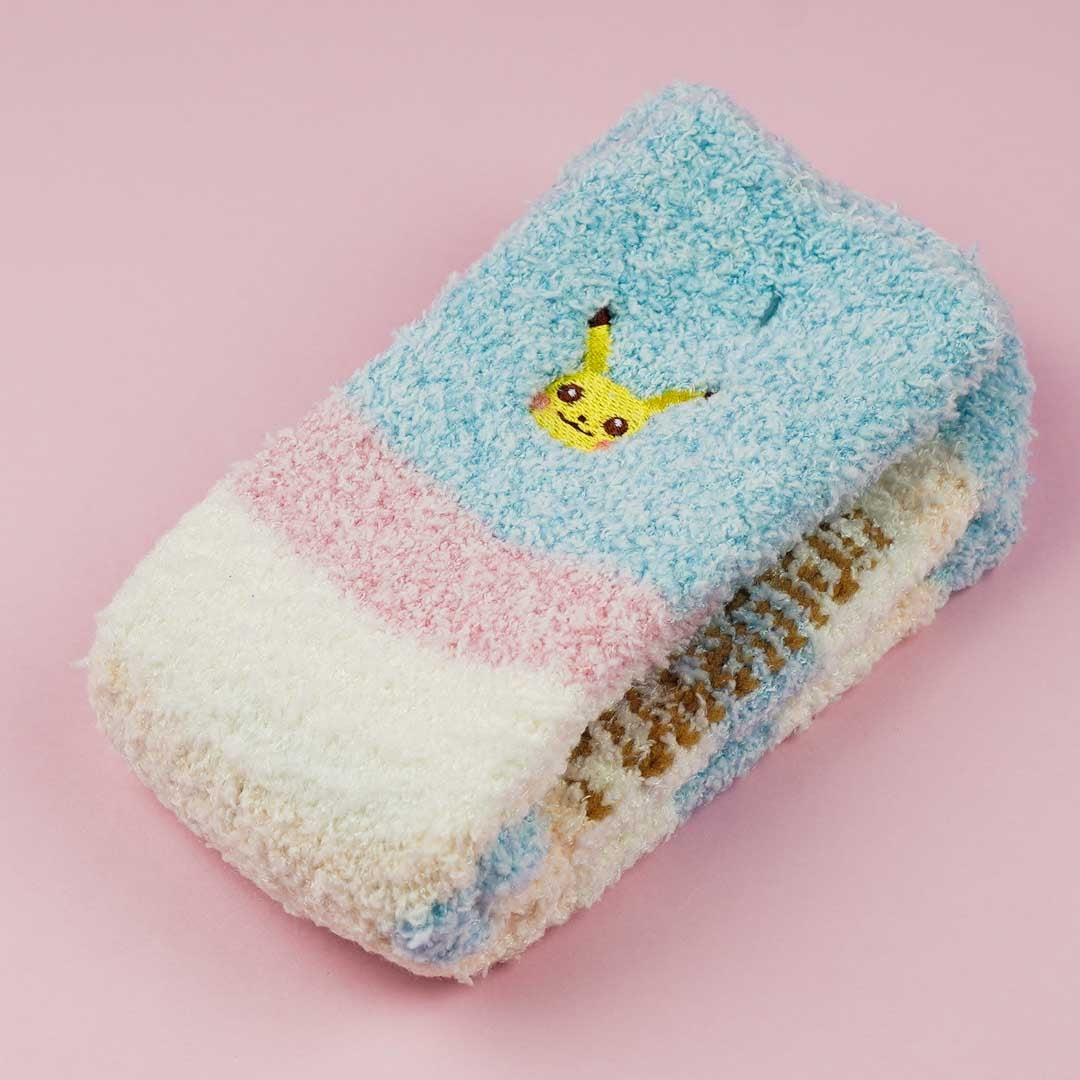 This cute pair of fluffy socks is perfect for keeping your feet nice and warm. It showcases embroidery of Pikachu.