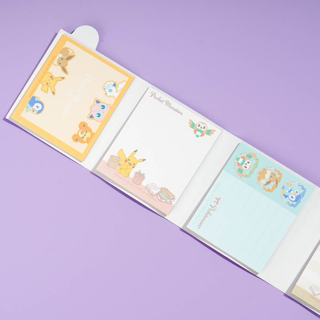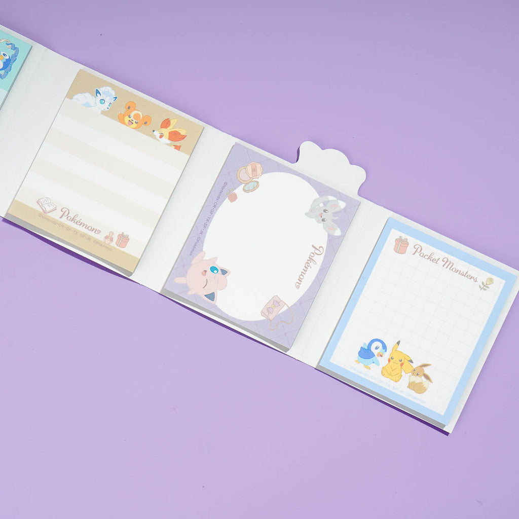 This super kawaii memo pad set features cute illustrations of Pokemon friends gathered together! It includes a folding booklet-type cover and six pads with different designs. Use this when writing your important reminders.