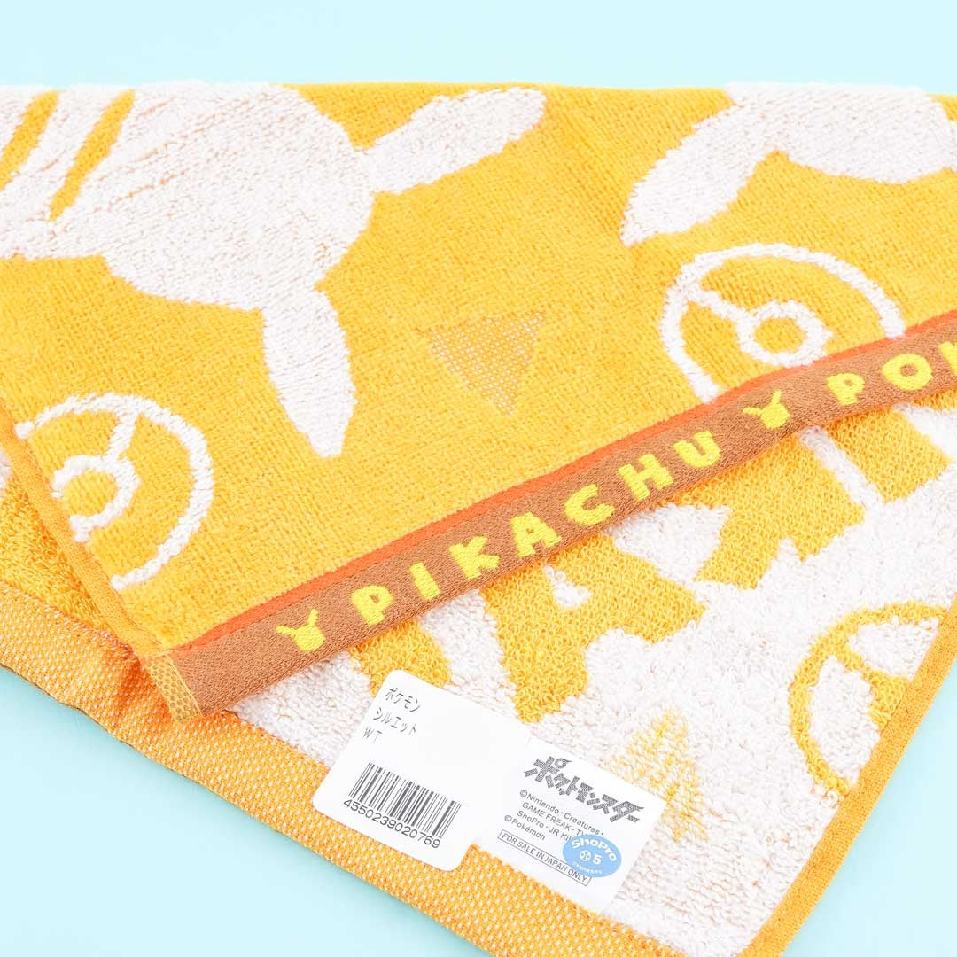 • A mini square-shaped towel with silhouette prints of Pikachu and pokéballs