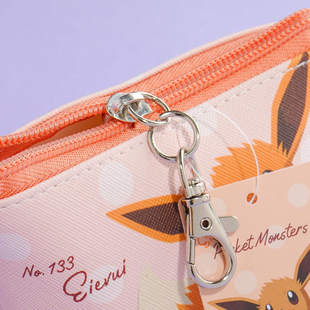 This cute pouch has a unique triangular base and illustrations of polka dots and Eevee! Use this handy zippered case to keep loose change and other important small items.