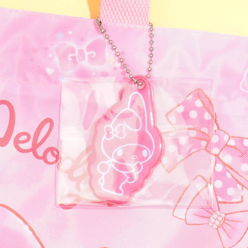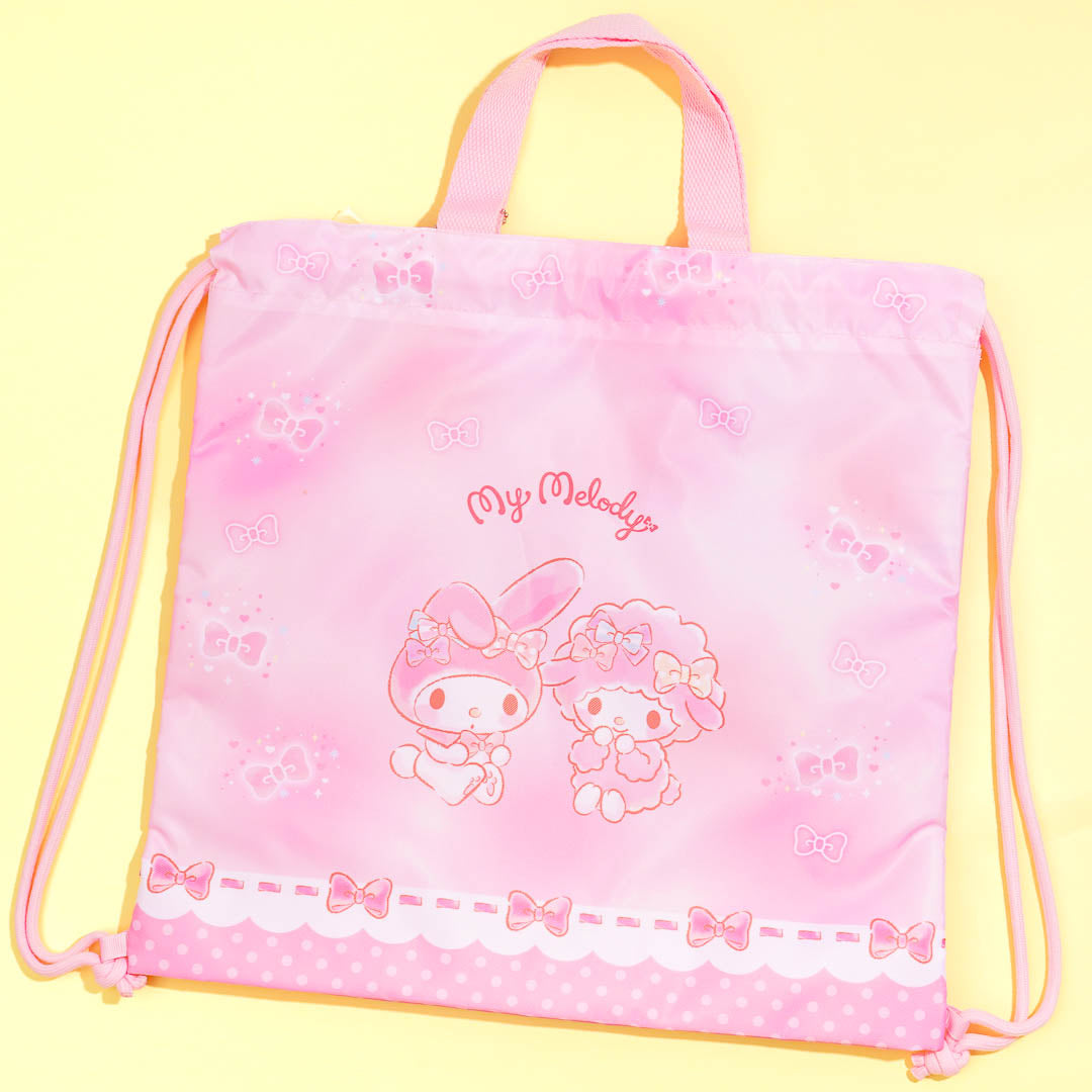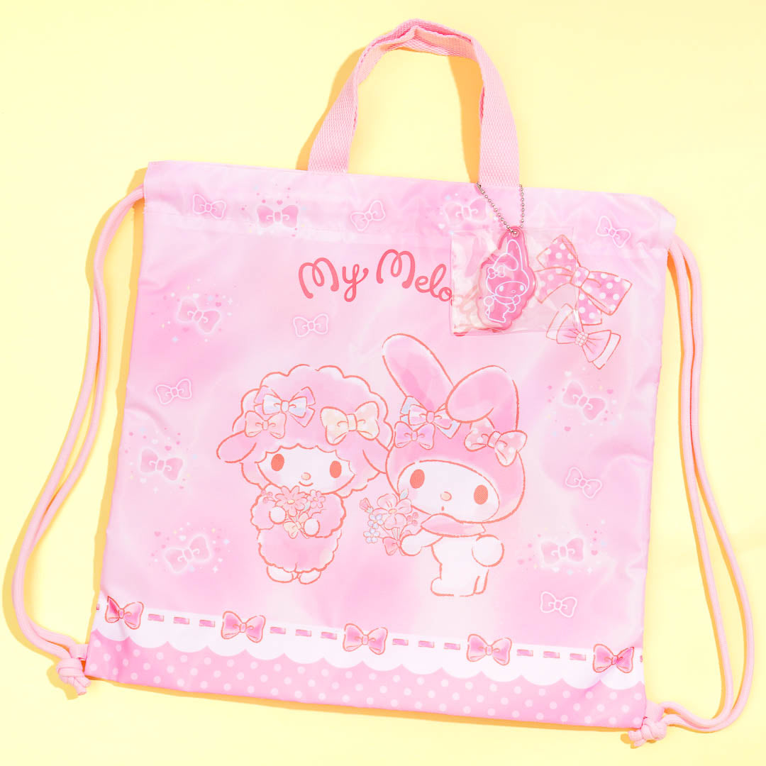 This kawaii knapsack showcases a print My Melody and My Sweet Piano picking flowers together. Use it to bring an extra change of clothes when you head to the gym! It comes with a cute puffy charm. You can attach the charm anywhere you'd like with the help of its removable ball chain.