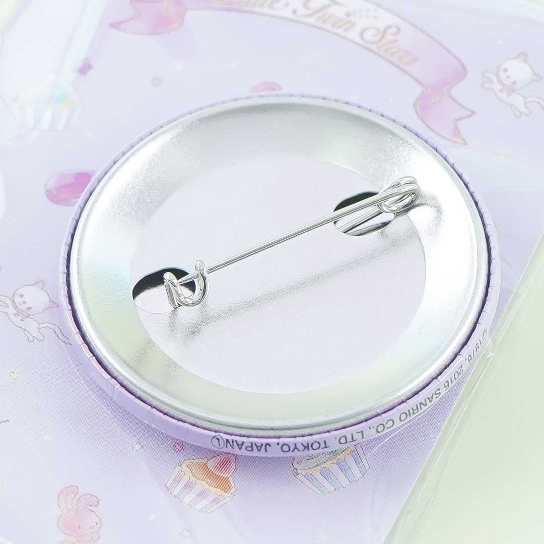 • A mini kawaii badge featuring a pastel illustration of the Little Twin Stars with sweets