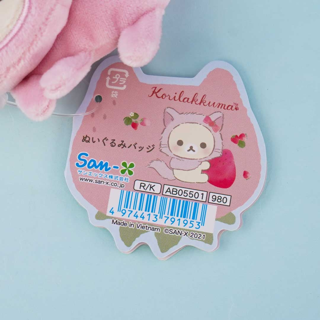 This Korilakkuma plushie badge is dressed up in a strawberry-themed costume. It comes from the "Rilakkuma & Strawberry Cat" plushie series. You can attach it to your bag with its safety pin.