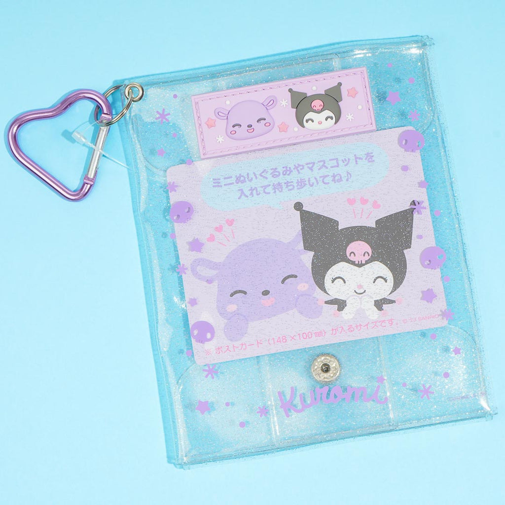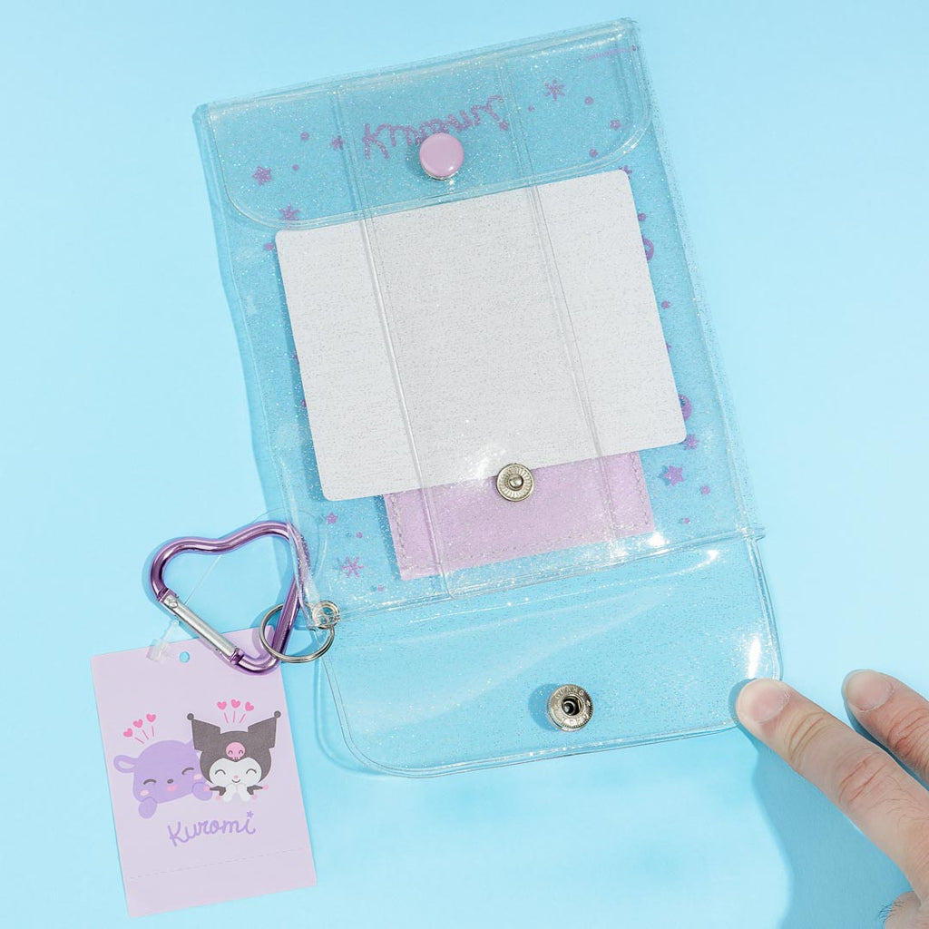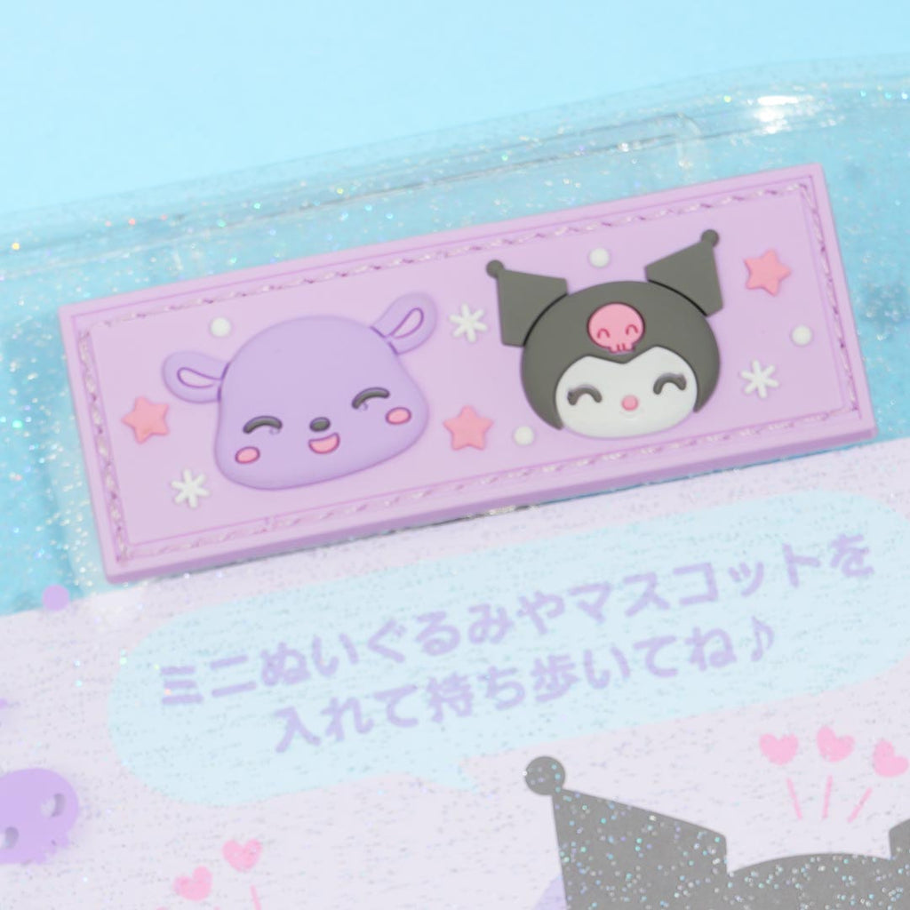 Keep your trinkets inside this super kawaii pouch! It features the cute smiling faces of Kuromi and Baku. The glittery plastic pouch has two snap button closures and a metal carabiner.