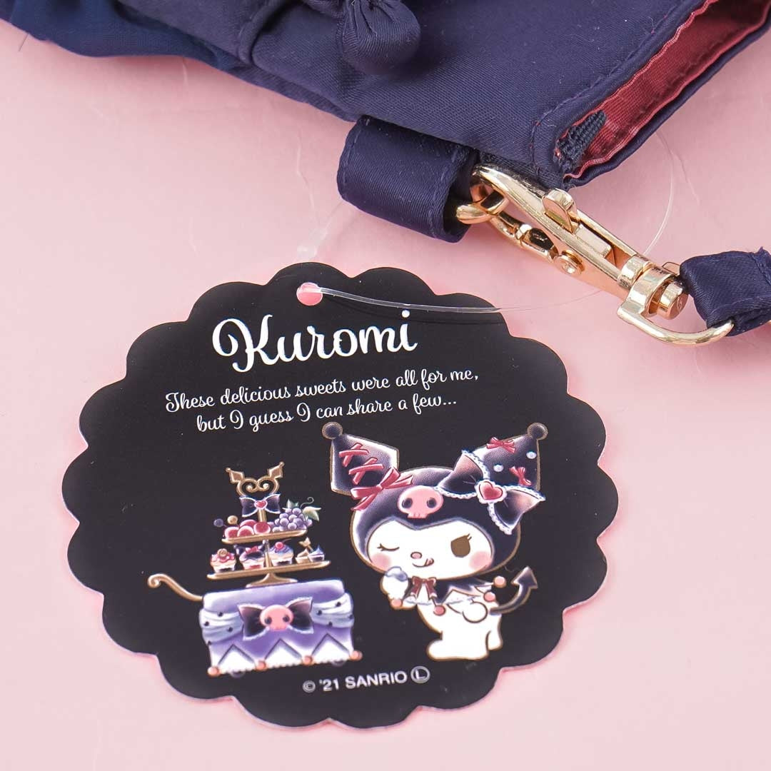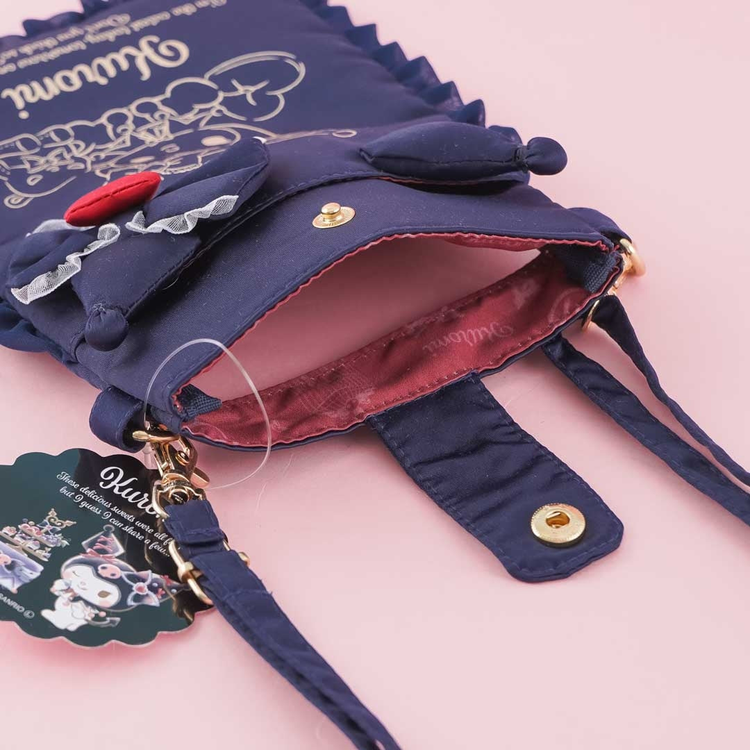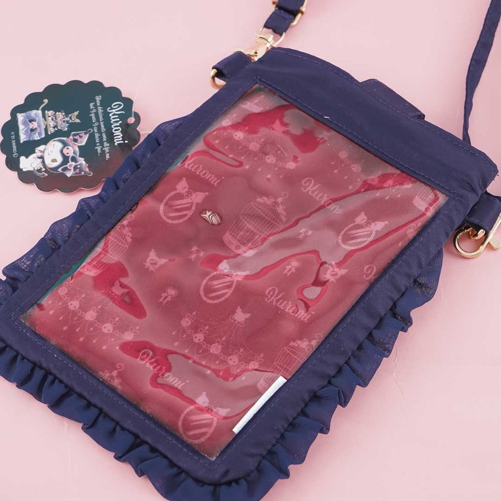 This super cute dark-colored pouch has a frilly design with a print of Kuromi wearing a Gothic Lolita outfit! Carry it around using its detachable and adjustable strap. It has a button closure on its main compartment, a front pocket, and a big transparent back pocket.