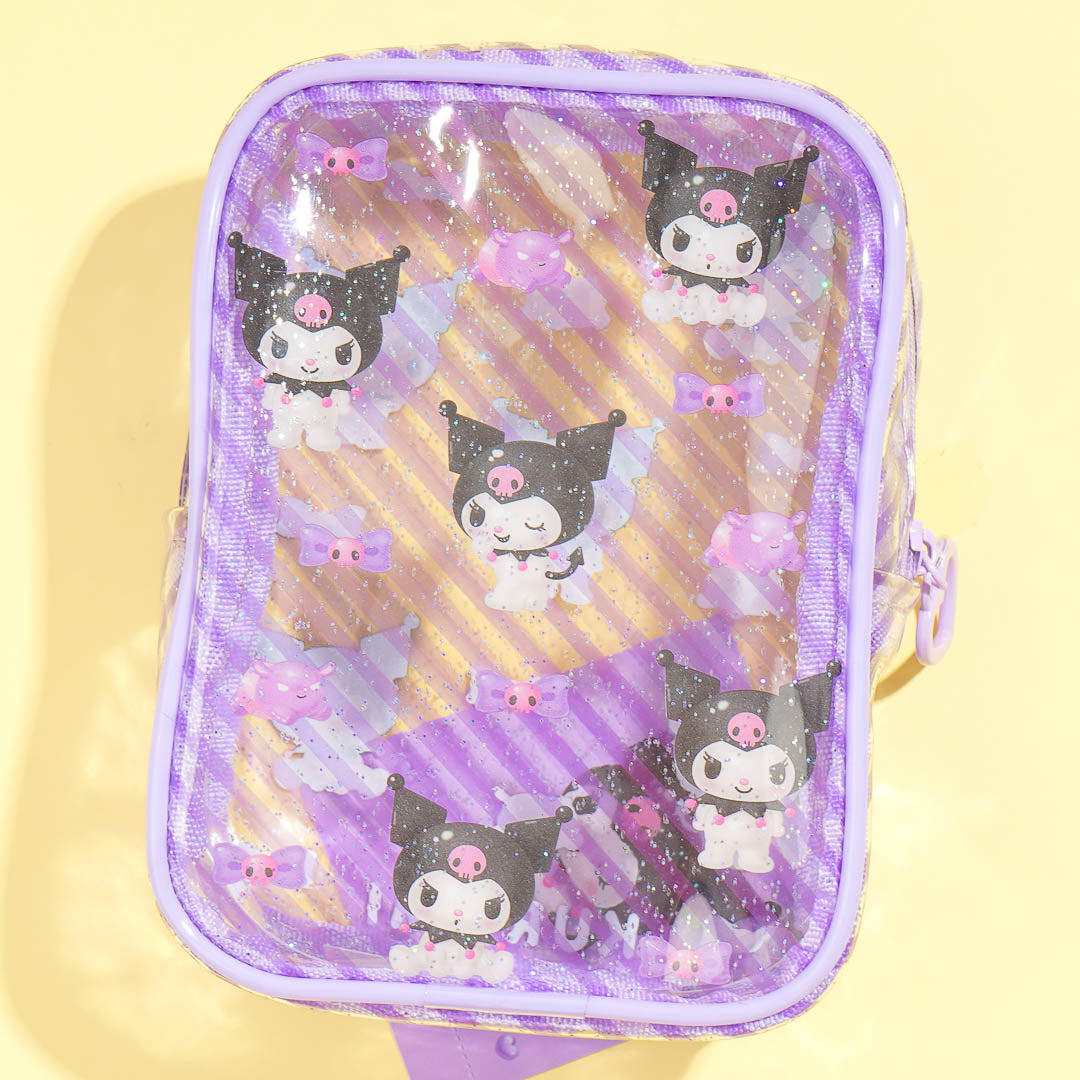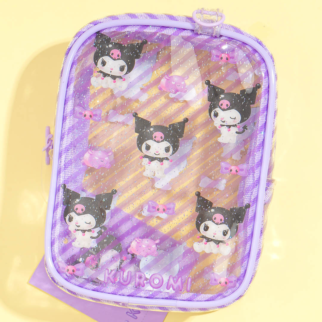 Use this super cute box-shaped glittery pouch to store your makeup. It's illustrated with Kuromi playing around! This zippered pouch also has a heart-shaped pendant.