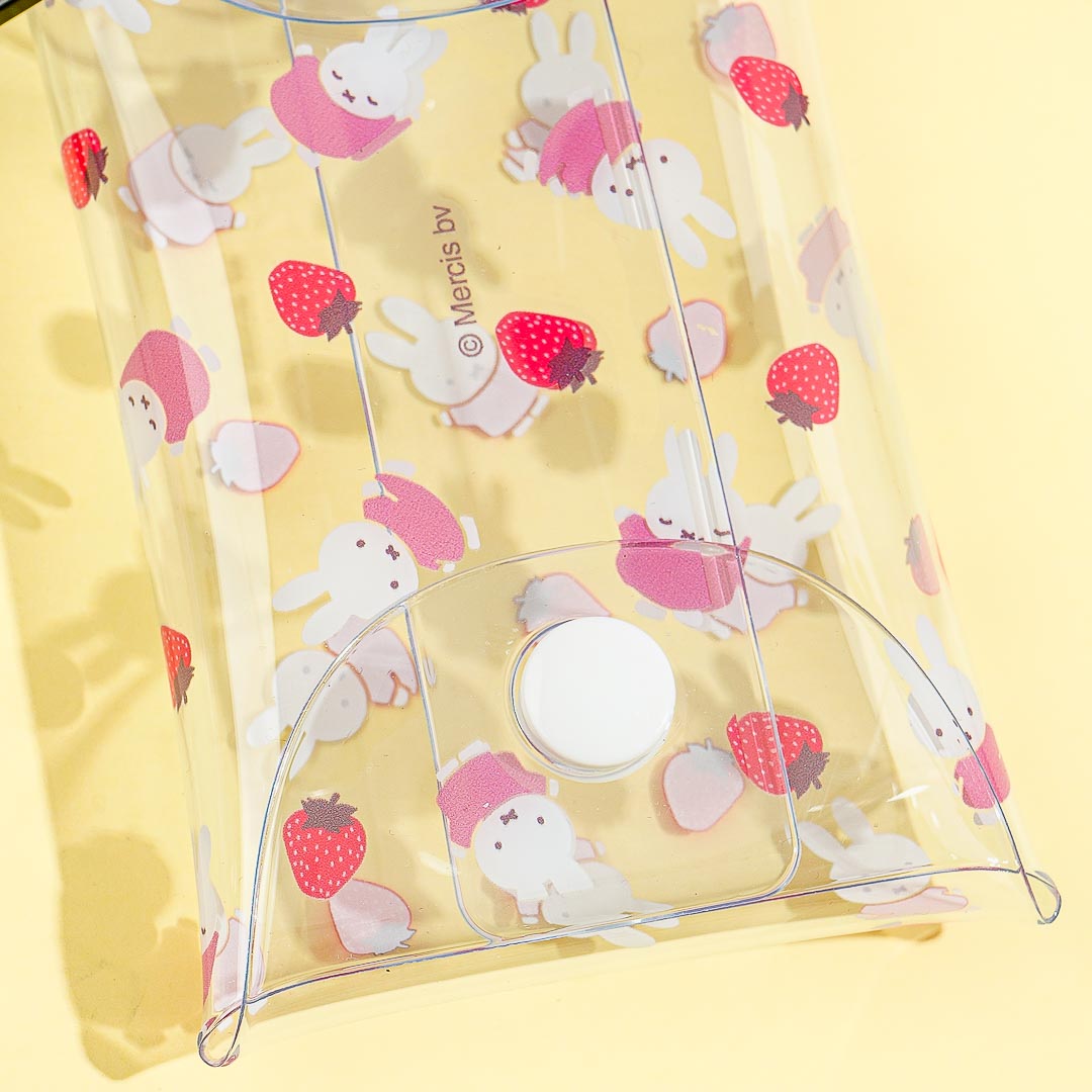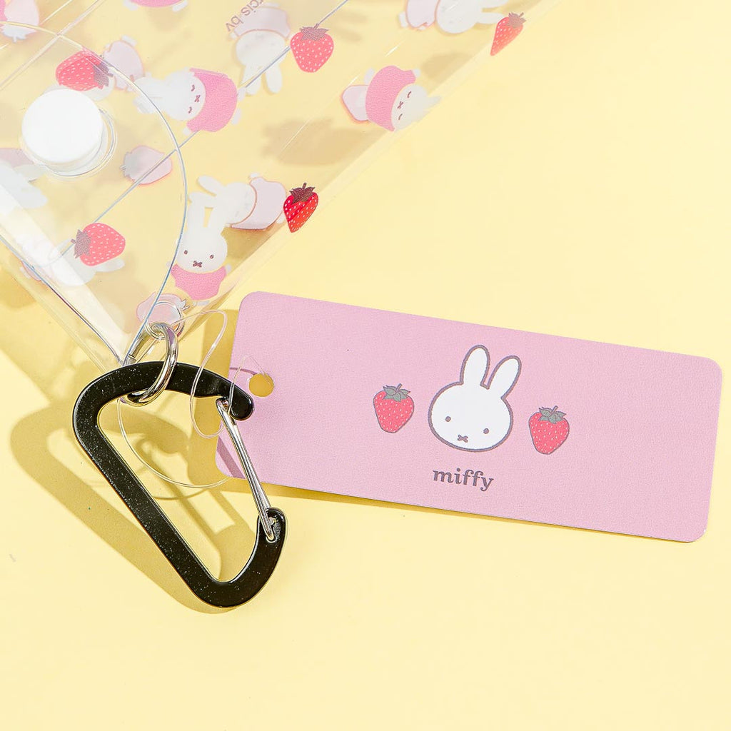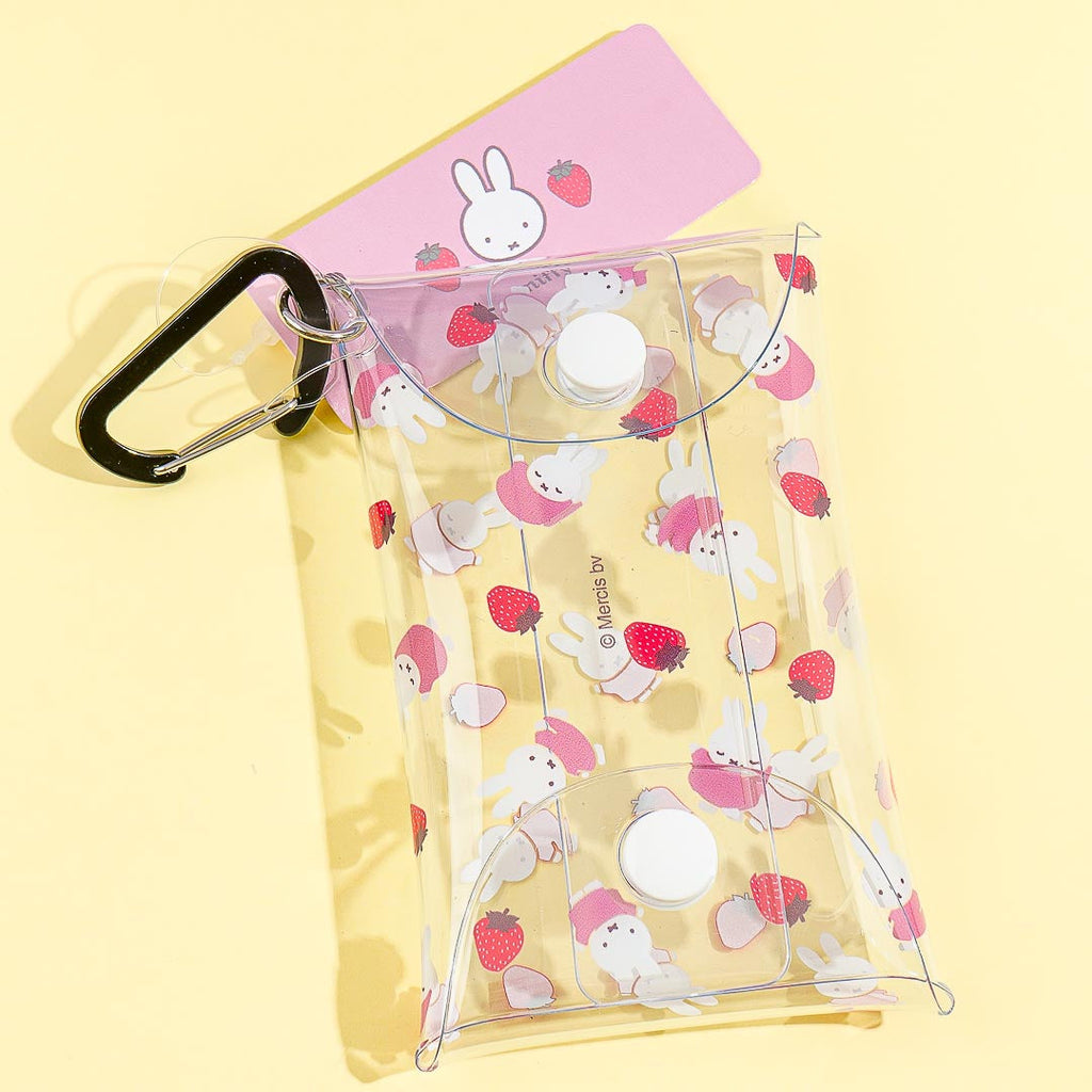 Store pocket tissues, charms, and other knick-knacks inside this super kawaii clear case. It's covered in prints of Miffy and strawberries! This clear case has button closures on both ends. You can hang it on your bag with its metal clip.