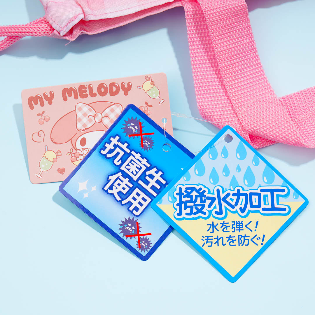 This cute drawstring backpack is illustrated with prints of My Melody having some crepes and cream soda with her friend, Flat. Not only does it have a handle, but it also has a water-repellant finish. Use it to bring your essentials while strolling around the park!