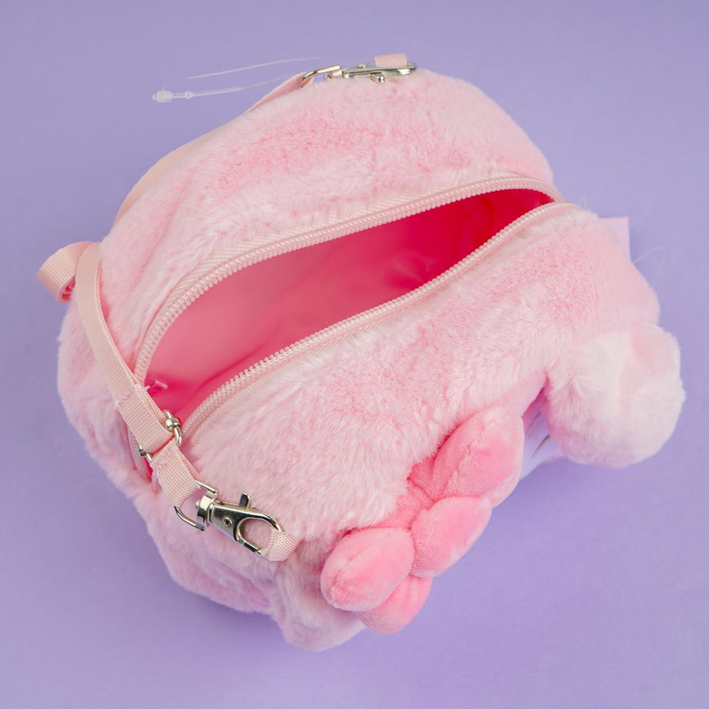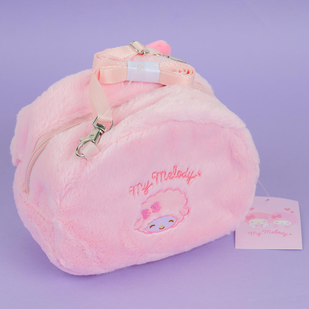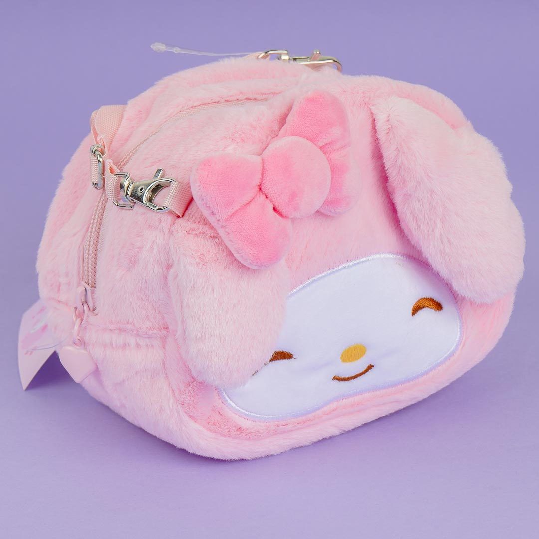 This kawaii zippered sling bag features My Melody's face with pop-out ears and a ribbon! It has an embroidered illustration of My Sweet Pianos at the back along with Kuromi's name. The bag is perfect for carrying around your thing while out and about!