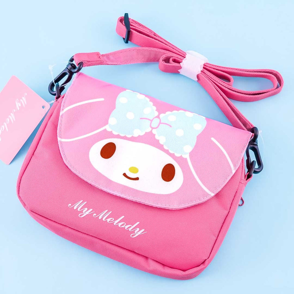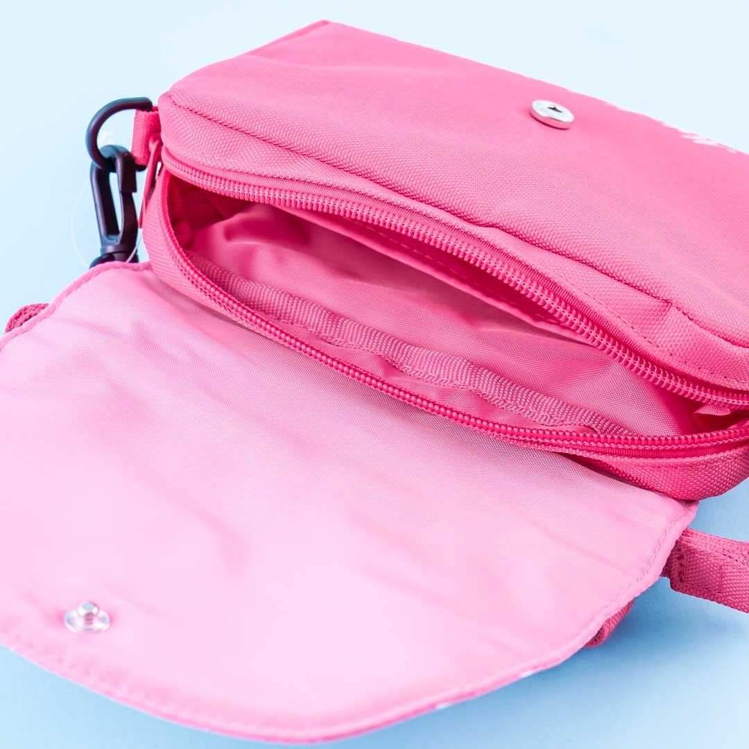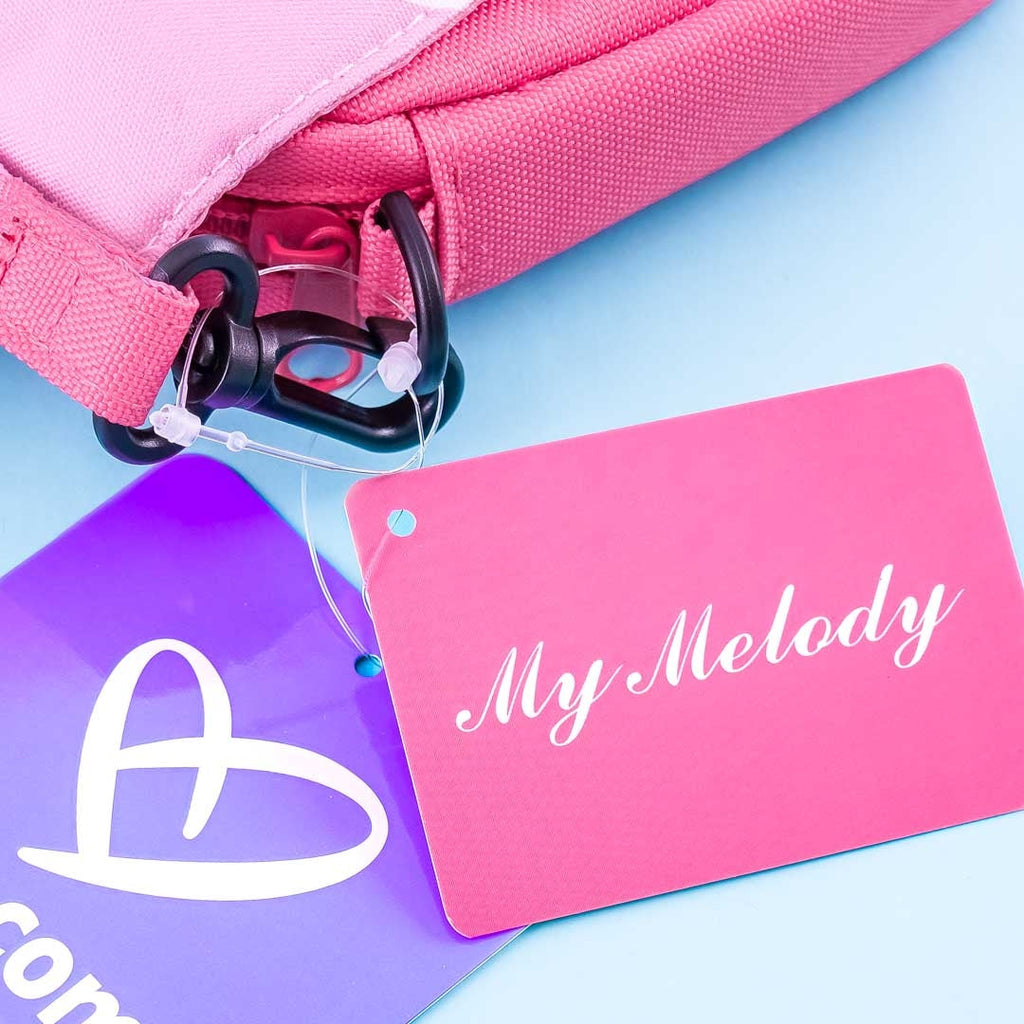 This super cute mini-sized bag illustrated with My Melody's face doubles as a pouch and a shoulder bag with its removable strap! You can put your phone inside its transparent pocket and still be able to use it. It also features a spacious compartment with both a magnetic flap and zipper closure.