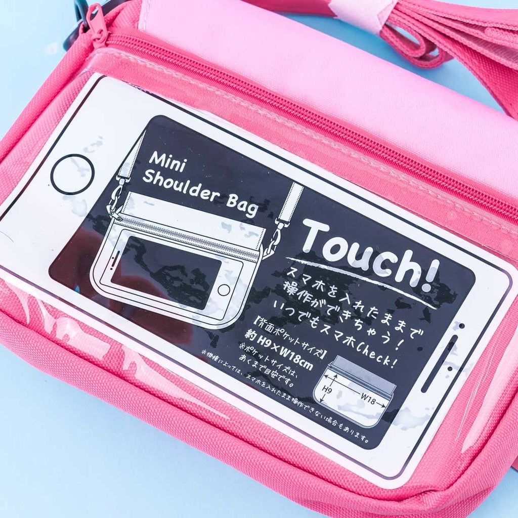 A mini-sized My Melody sholder bag with a transparent smartphone pocket