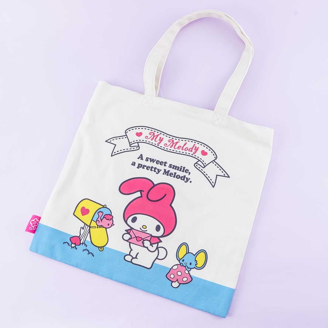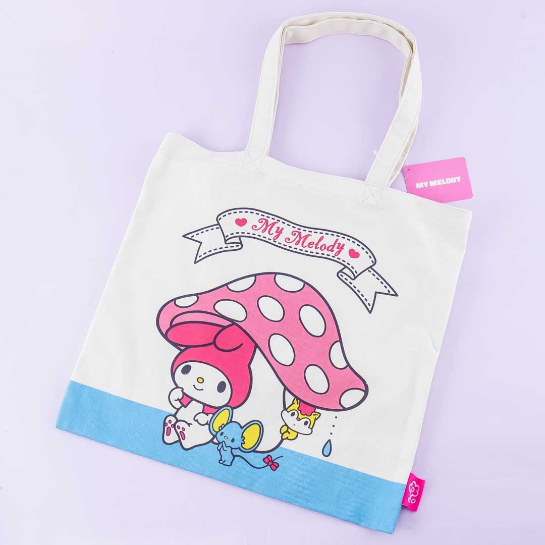 A kawaii tote bag illustrated with My Melody and her friends together with mushrooms