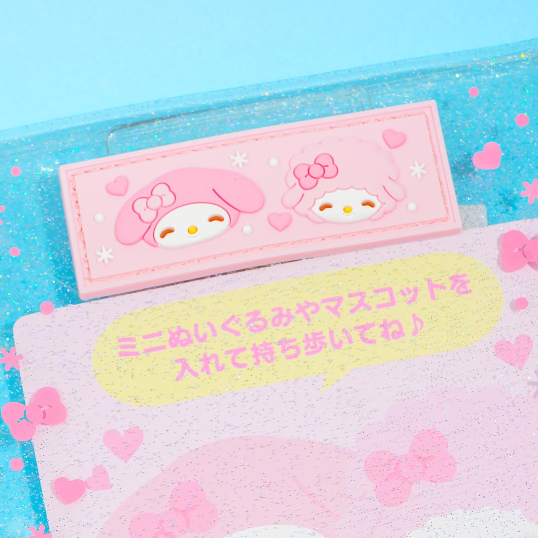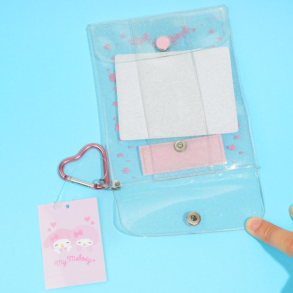 This cute and glittery clear plastic pouch features the happy faces of My Melody and My Sweet Piano. It comes with a metal carabiner and two snap-button closures. Use this to keep your stickers, cards, and other small collectibles!