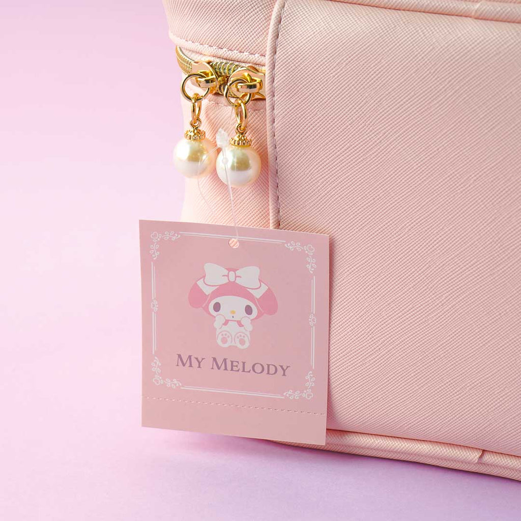 Features a double zipper closure with cute pearl charms