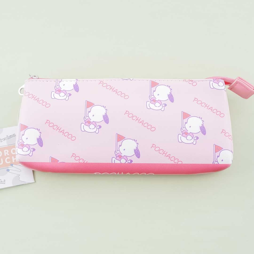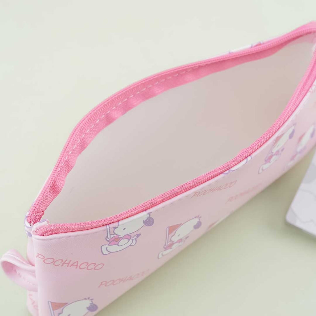 • A kawaii pouch with multiple matching illustrations of Pochacco holding a flag