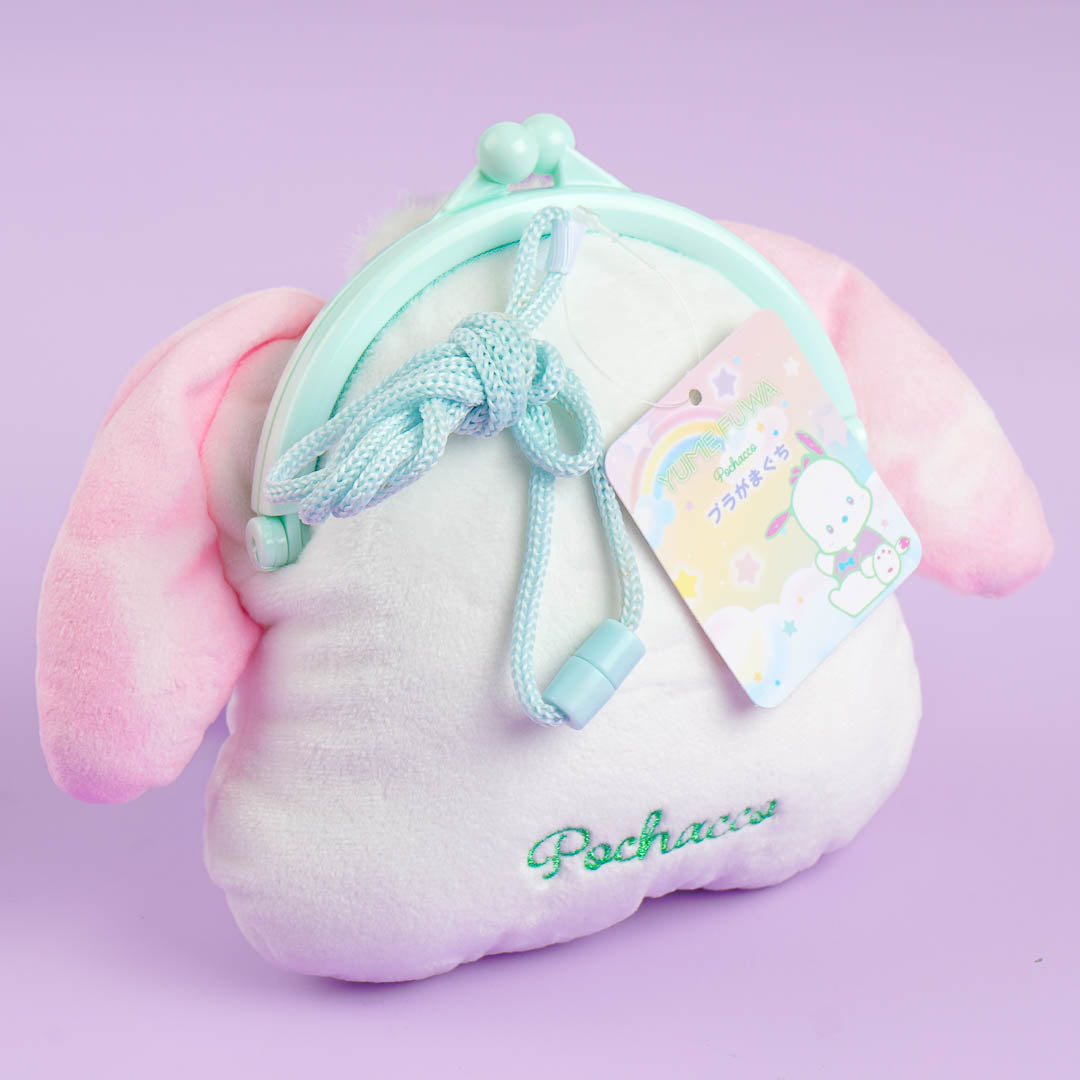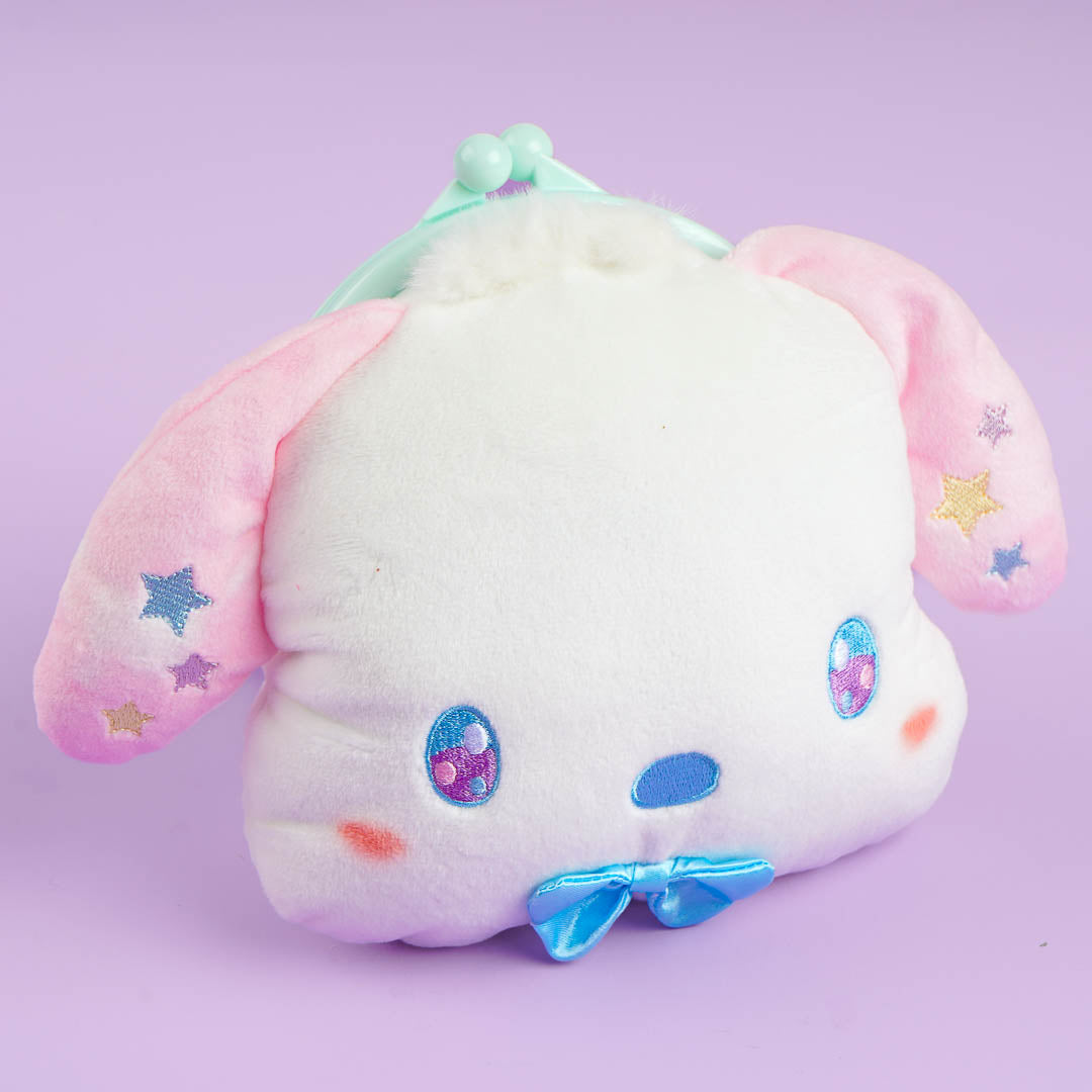 This super cute coin purse is shaped like Pochacco's head! It's made from soft and fluffy material and is decorated with colorful star embroideries. You can wear this cute purse on your neck using the string and show it off to your friends!