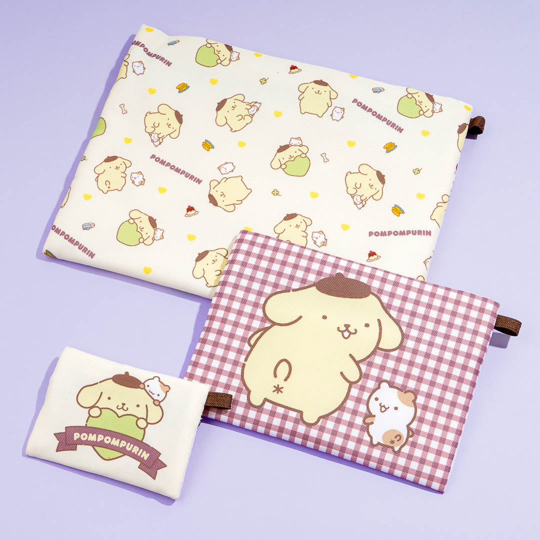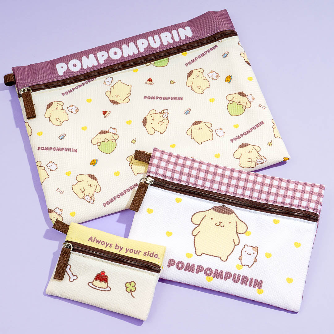 These flat pouches showcase prints of Pompompurin hanging out with his buddy, Muffin! Use them to organize your charms, trinkets, makeup, and other items. Each of these pouches has a zipper closure to make sure your things are safe and secure.