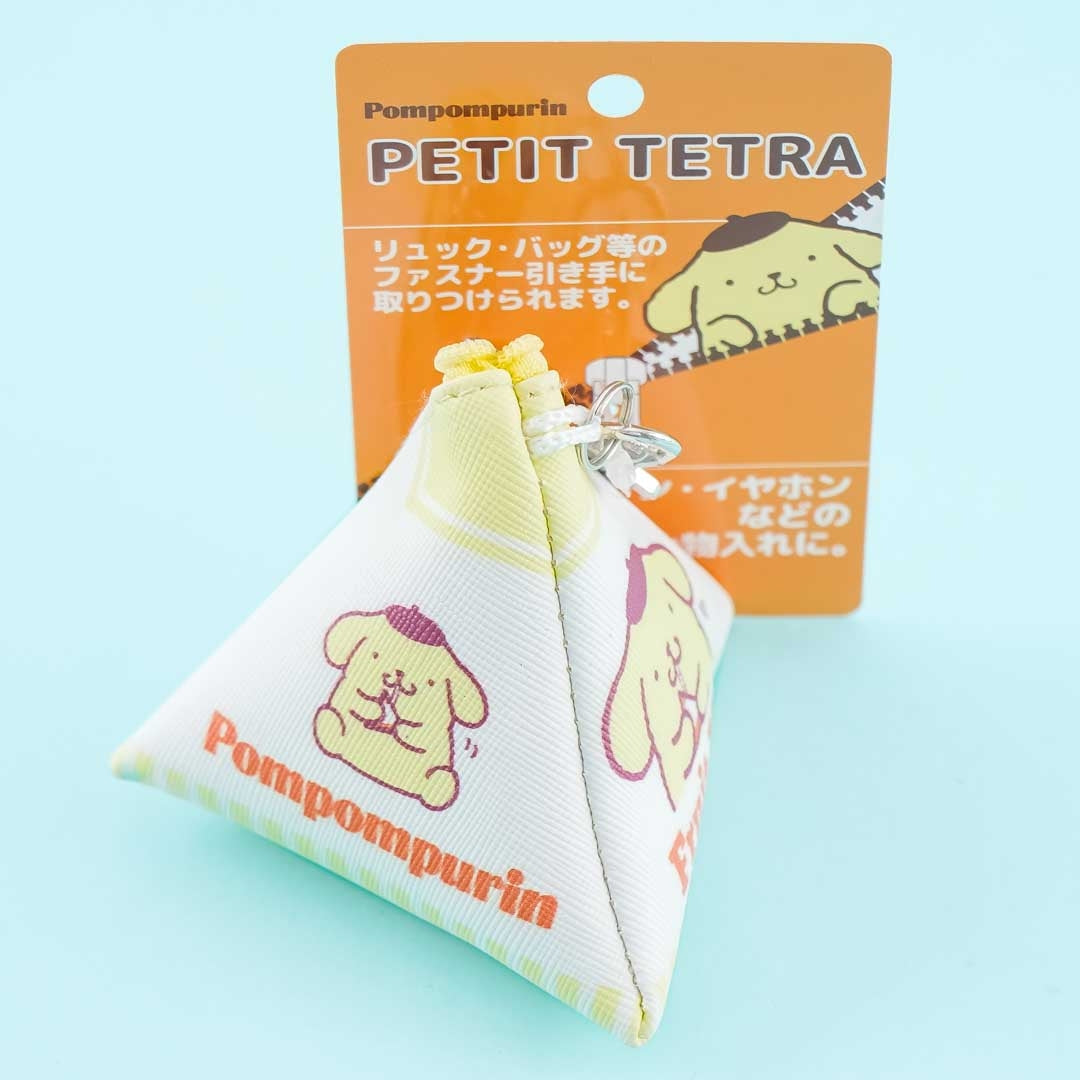 • A cute mini triangle purse with illustrations of Pompompurin holding a tetra juice pack