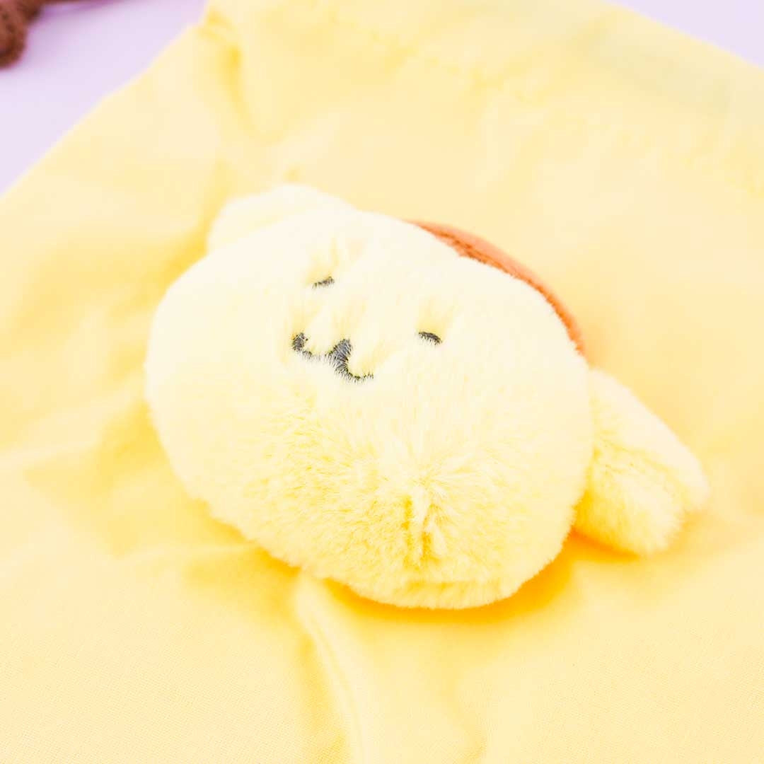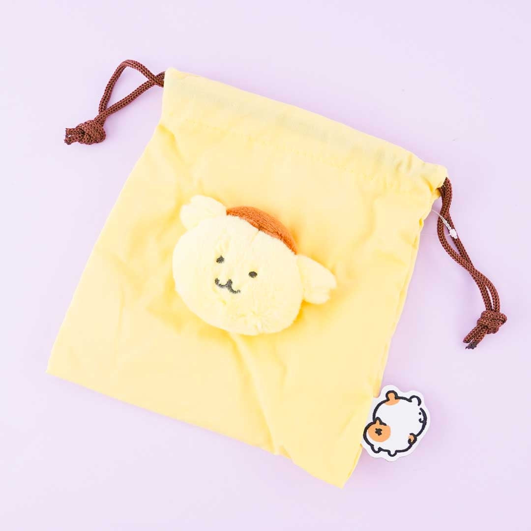 A kawaii drawstring pouch with a fluffy Pompompurin face decor and a die-cut Muffin tag