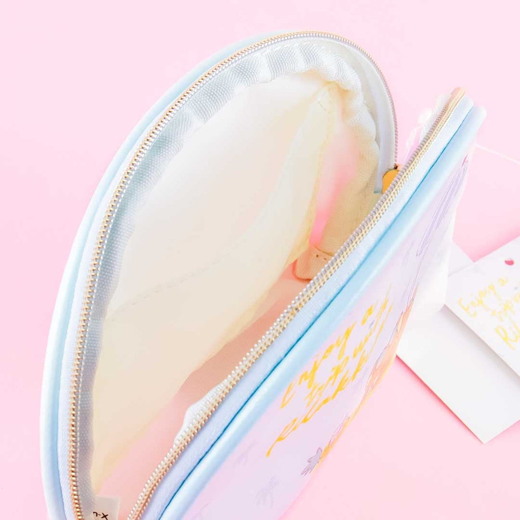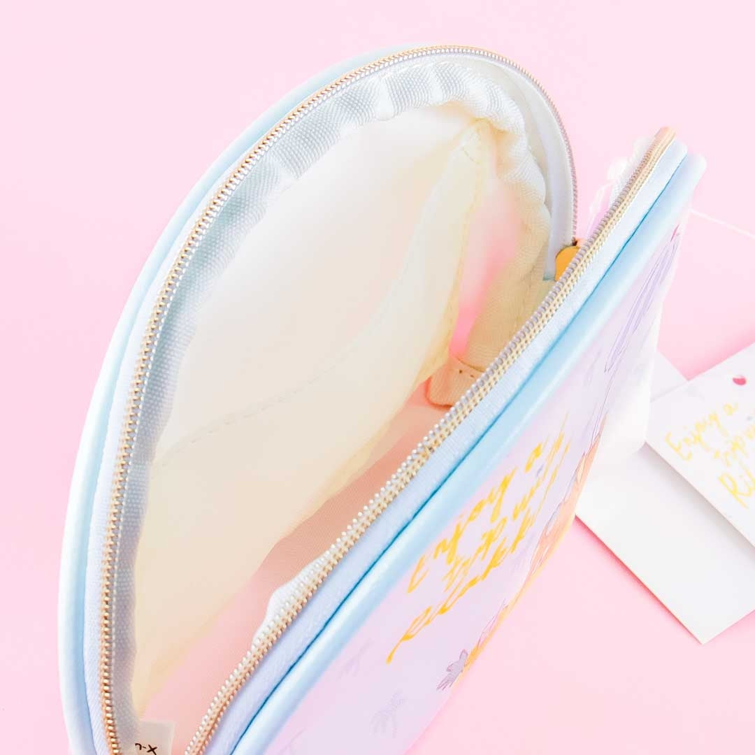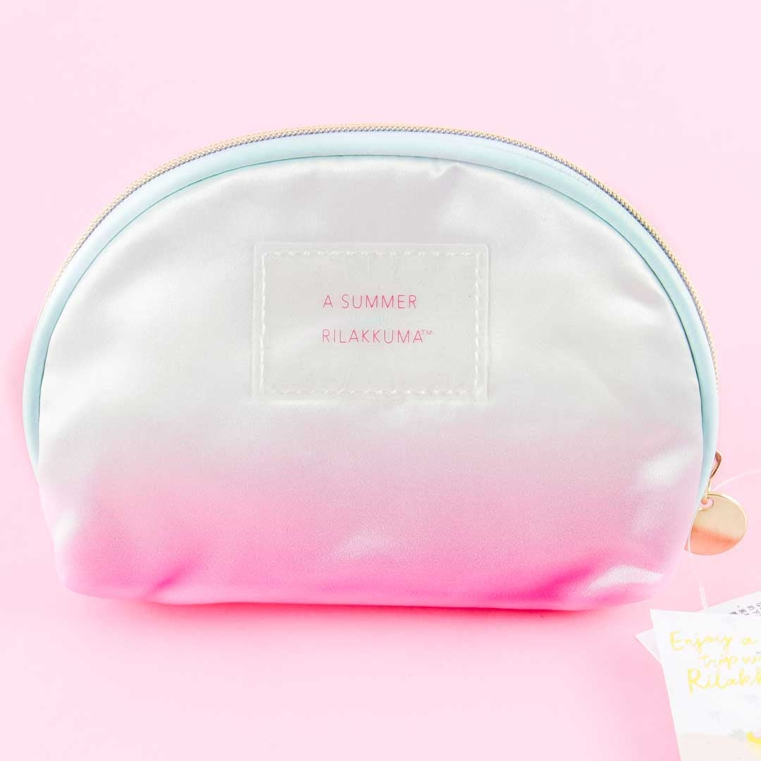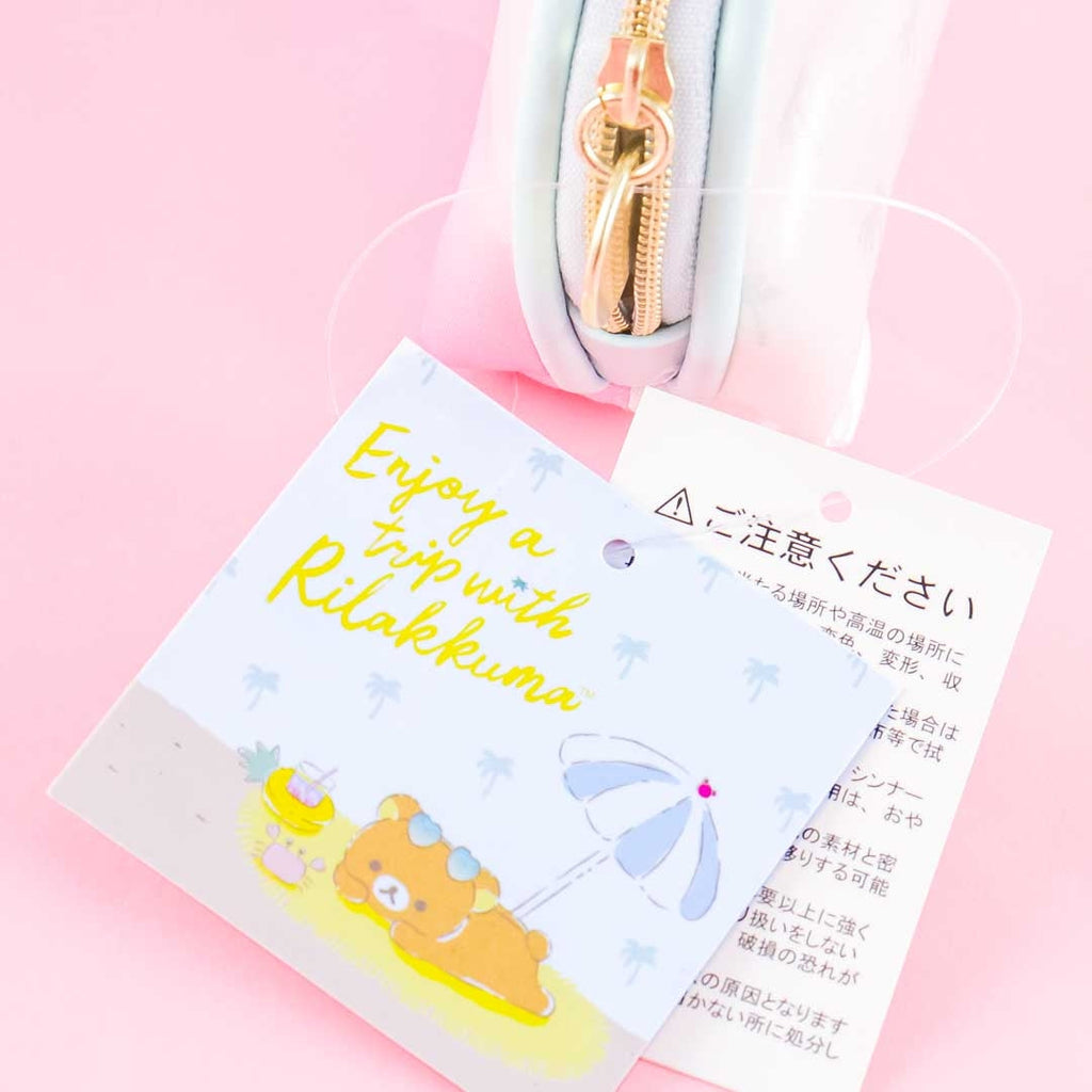 Use this super kawaii pouch featuring Rilakkuma sunbathing at the beach to keep all of your make-up essentials! This smooth and shiny pouch has a zipper closure and an inner pocket for small items. It also has a plastic tag at the back with the words "A summer trip with Rilakkuma."
