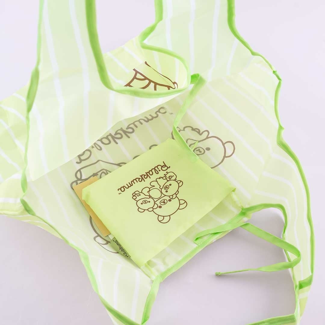 Carry your books or groceries in kawaii style using this cute two-way reusable tote! It features an illustration of Rilakkuma with Kiiroitori, Korilakkuma, and Chairoikoguma and comes with an inner pocket! Depending on the amount of stuff you place inside, you can change the size of the bag by simply folding the sides and fastening the button below the tote. When not in use, you can easily fold the entire striped polyester bag and tuck it away inside the pocket.