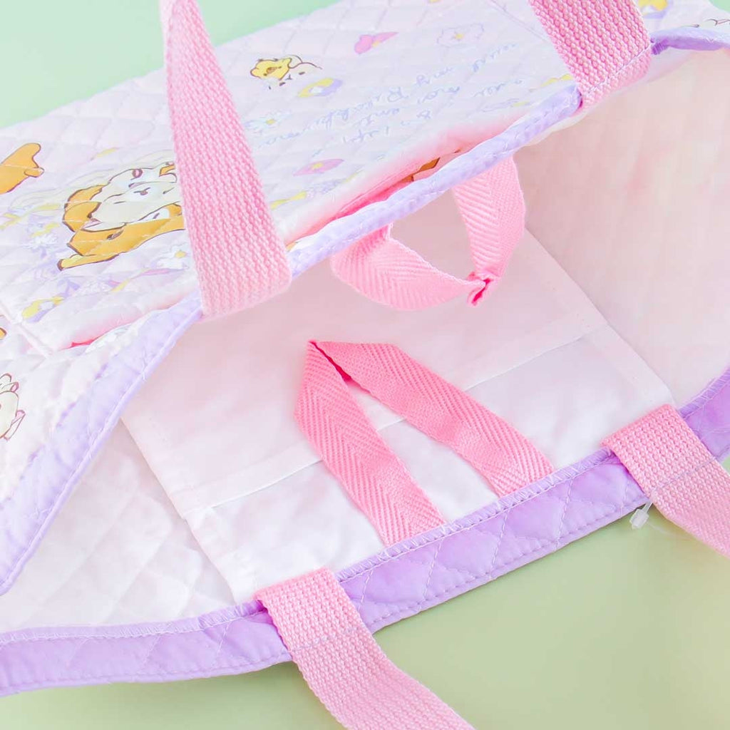 Keep your school books organized using this quilted floral bag featuring Rilakkuma, Korilakkuma, and Kiiroitori! This spacious handbag made of soft material has an inner pocket and an outer section with velcro closure. You can also switch between two pairs of handles when carrying it.