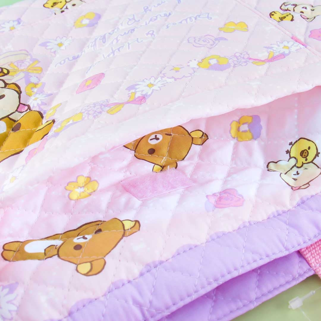 • A kawaii quilted handbag with illustrations of Rilakkuma series characters and flowers