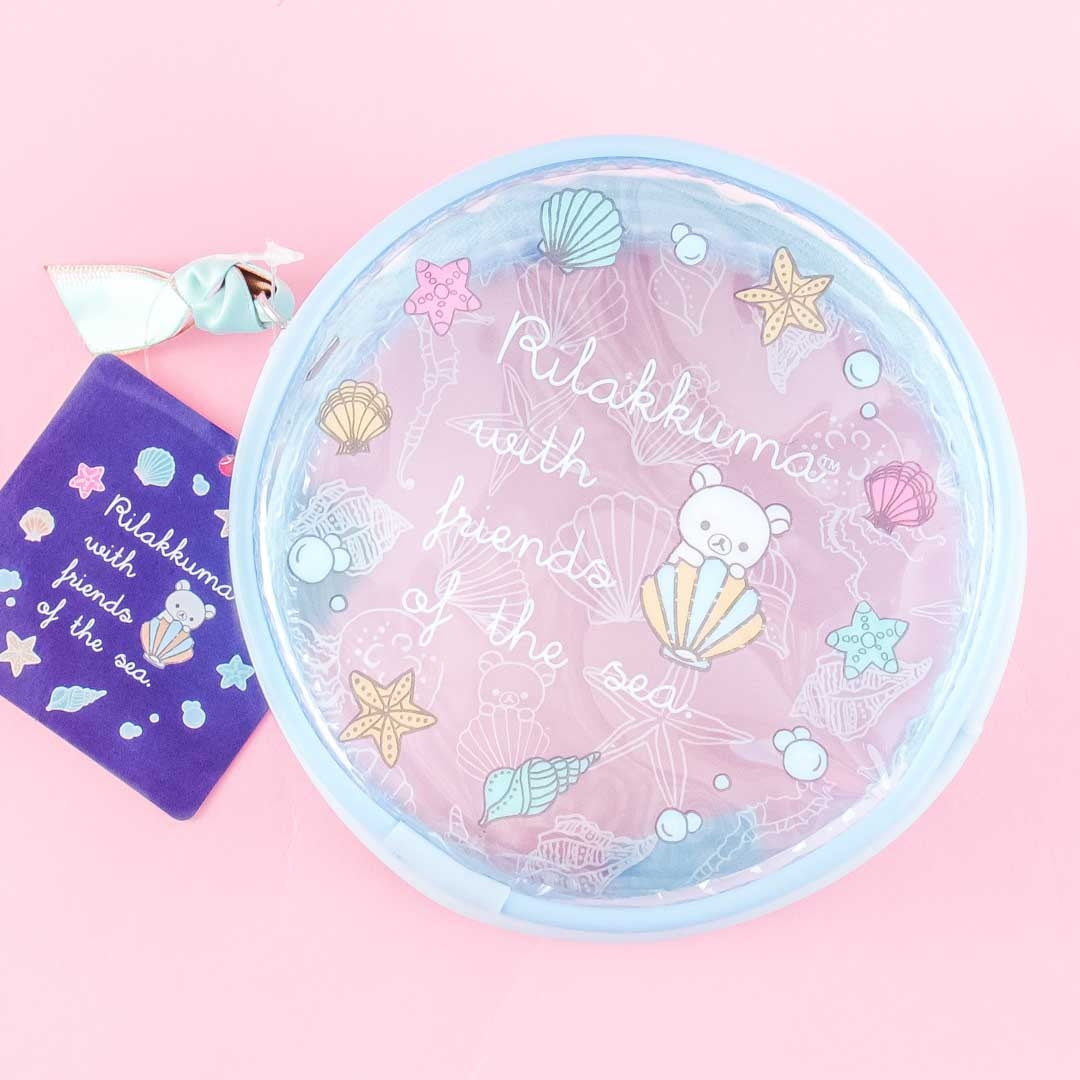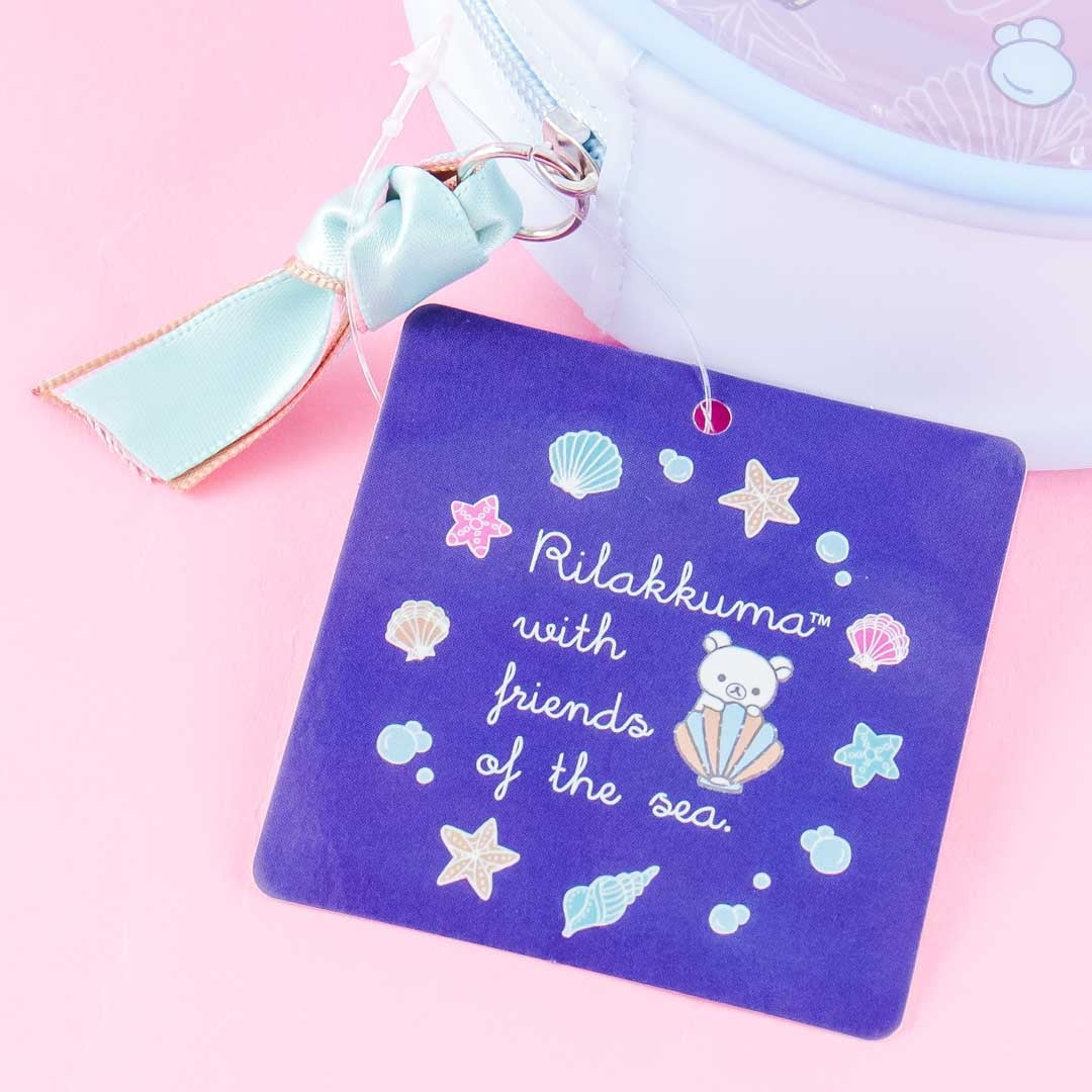 Keep your make-up and accessories safe using this kawaii pouch featuring Rilakkuma with different sea creatures! This transparent plastic pouch features a zipper closure with a blue ribbon.